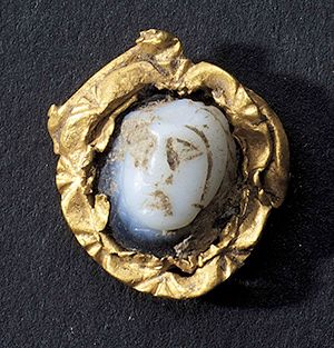 Engraved Gems & Cameos. Onyx cameo set in gold. Roman, Balkan region, circa 2nd- 3rd century AD. D/ Stylized man's head with hair realized with thin incisions. The gem is surrounded by scrolls made of gold sheet. Oval 15 x 12 mm.