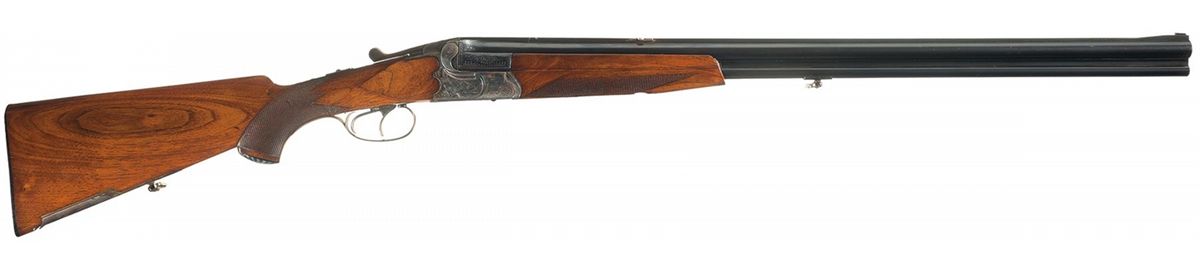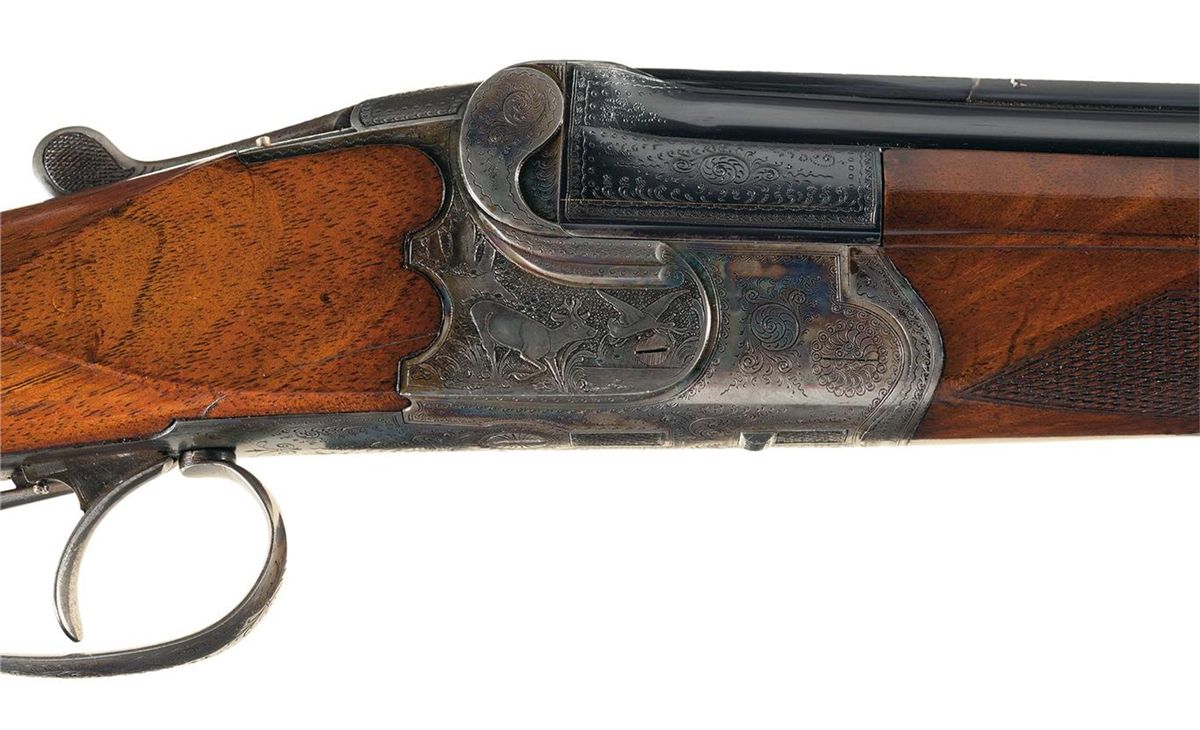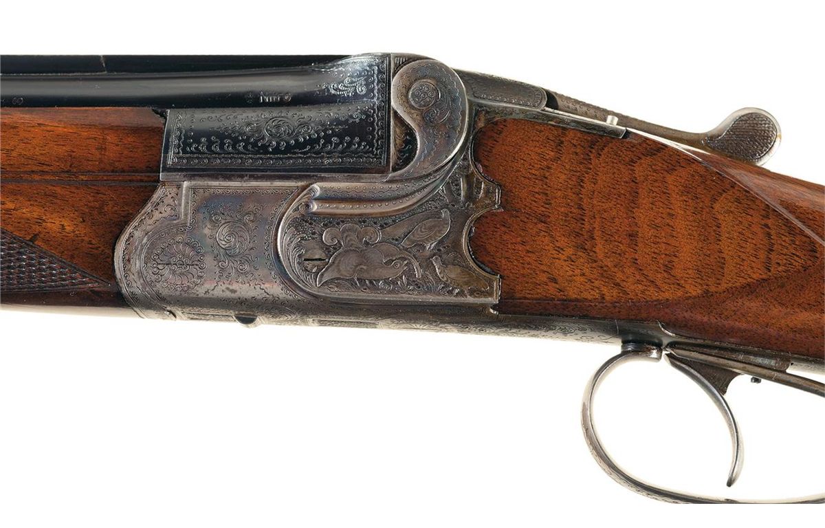 Solid rib barrel with a bead front sight and folding blade rear. Choke is extra full. The lower rifle barrel is chambered for the 9.3x72R cartridge. The proof date is "10/23". "FLUSS STAHL" barrel markings. Sling swivel attached to the rifle barrel. Scroll engraved scalloped boxlock action with game scenes. Capercaillie grouse on the left side, roe buck and a duck on the right. Set rifle trigger, cocking indicator pins, and tang safety. Checkered pistol grip stock with cheekpiece with horn grip cap and buttplate, bullet trap and sling swivel. Checkered forearm with an engraved casehardened Deeley edge lock.