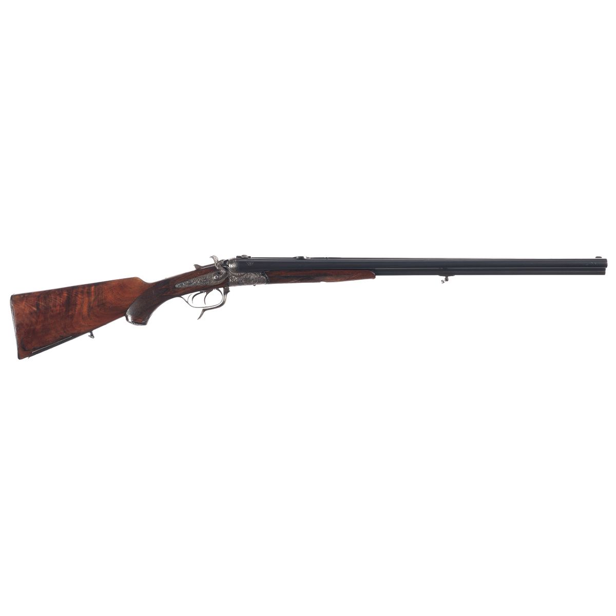Bead and folding notch sights, with game scene, scroll and floral engraving on the frame and locks, claw bases, raised cheekpiece and cartridge trap. LOP 13 3/4".