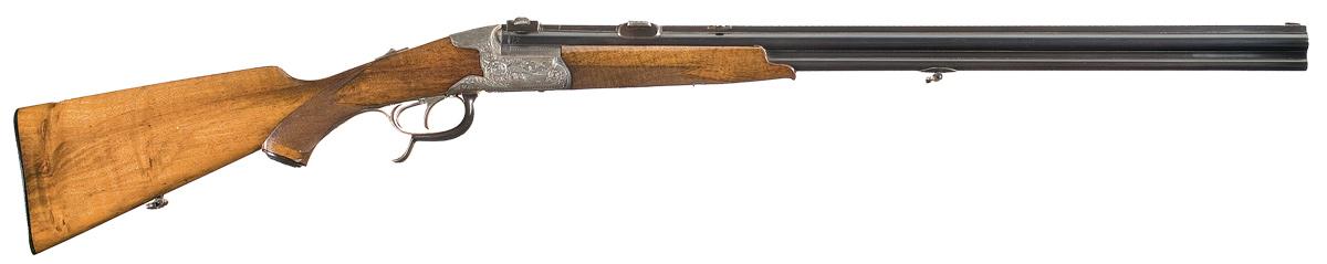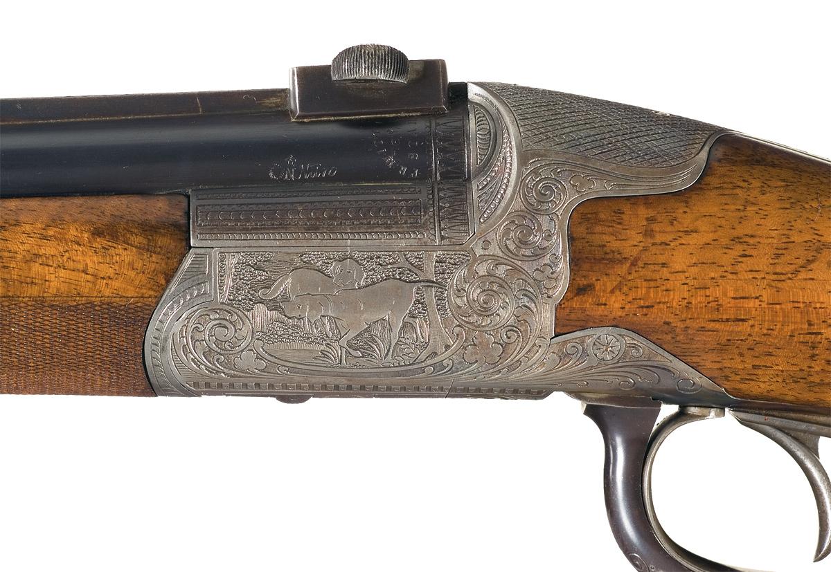 Produced in Suhl. Silver bead front and folding notch rear sight with silver triangle inlay. The top barrel has P.R. Wittener Steel markings on either side of the breech, Nitro proof on the left side, and a pair of claw bases added to the rib, cutting through the address. Border engraved breech, with deep scroll and checkerboard engraving on the frame, trigger guard and break lever, with a scene of two hunting dogs in the woods on the left side of the receiver and two deer and a duck in a lakeside scene on the reverse. Equipped with a tang safety, cocking indicator pins, and double trigger with single set front trigger. Checkered pistol grip stock, with Schnabel tip forearm, shadow line cheekpiece, attractive tiger stripe grain on the buttstock, sling swivels and a basket weave pattern horn buttplate. Length of pull is 13 3/4".