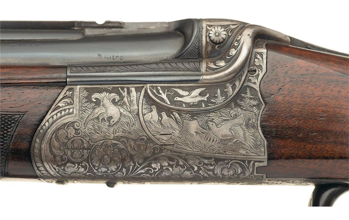Fine with refinished barrels. The barrels retaining 98% of the blue finish with some loss at the muzzle and some minor handling marks. The action retains traces of original case colors in the protected areas, otherwise faded to a gray. The wood is very fine with a small chip missing from the forearm, some minor handling marks and some scattered blemishes in the checkering.