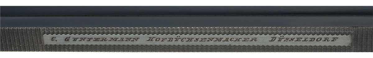 The matte solid rib is marked "C.GUNTERMANN HOFBUCHSENMACHER DUSSELDORF" with "KRIEGHOFF/MONTAGE/SEMPERT &/KRIEGHOFF/SUHL" on the scope base. Blade front and two leaf (one folding, one fixed) rear sights. The barrels are numbered to the gun. The shotgun barrel features a 2 1/2 inch chamber and extra full choke. The scalloped action features a floral engraving with game scenes: game birds on the left side, deer on the right side and a stag head on the underside. The floral engraving extends to the forearm hardware. Double triggers (rifle set trigger), horn trigger guard, cocking indicators and tang safety. The nicely figured checkered pistol grip stock features a cheekpiece, horn grip cap and thick horn buttplate. Length of pull is 14 inches.