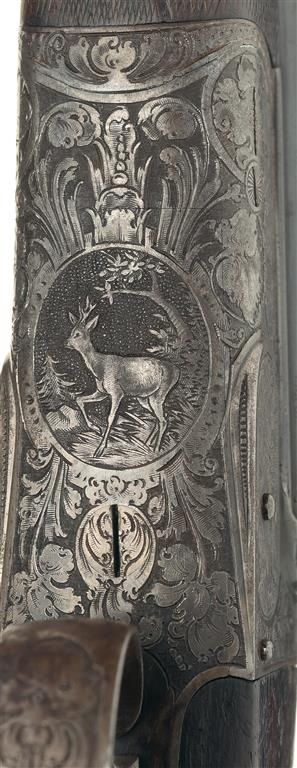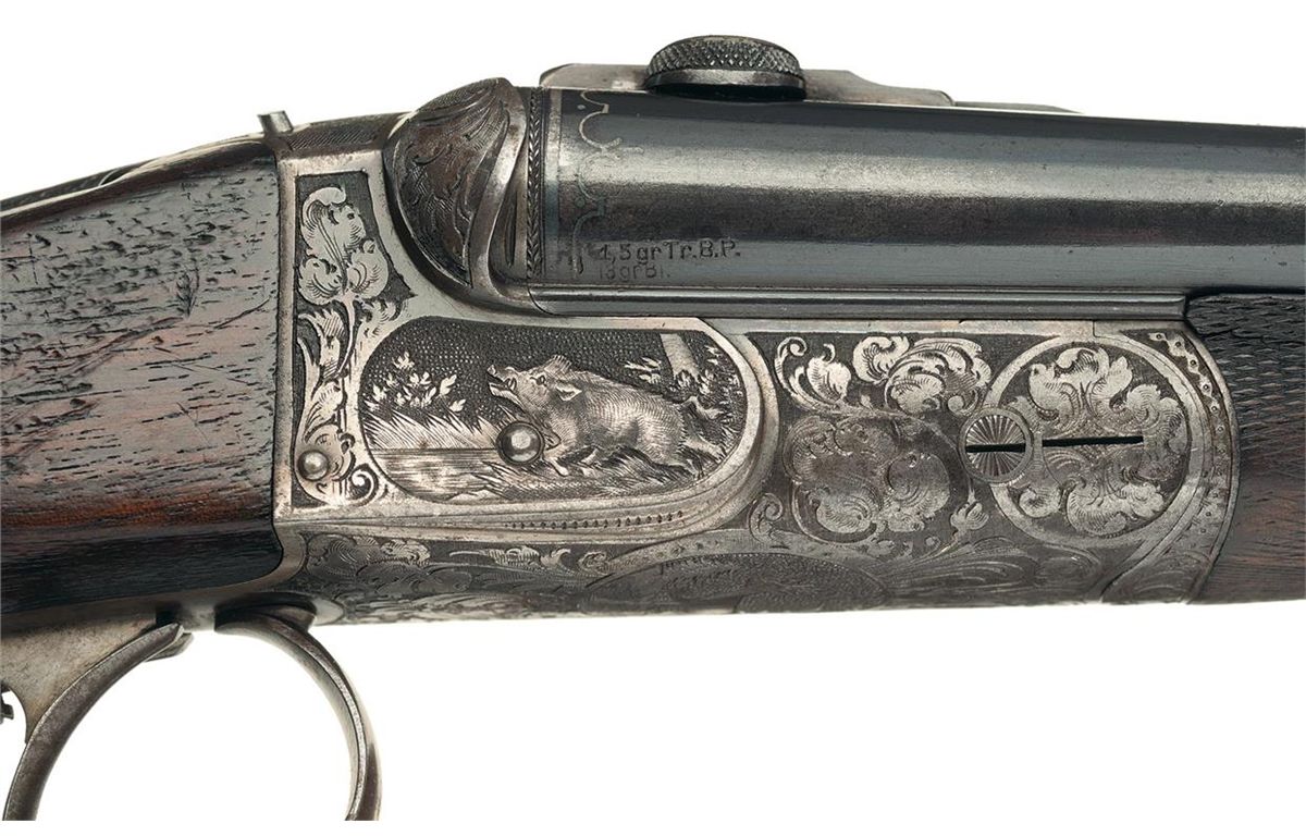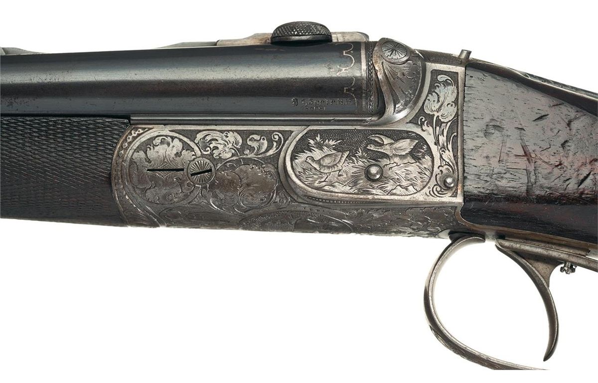 Bead front sight on the ramp rib. One standing and one folding leaf rear sight. Claw mount scope bases and the rib is marked "A. STRICKER GR. LICHTERFELDE". Floral engraved boxlock action with game scenes of a boar on the right side, game birds on the left and a Roe buck on the bottom. There are two silver inlaid wire bands on the breech end of the barrels. Double set triggers, cocking indicators, tang safety and mounted with a fancy English walnut checkered forearm with engraved Deely edge latch and round knob pistol grip stock with a small cheek piece, engraved cartridge trap, sling swivels and horn buttplate. Length of pull is 13 inches.