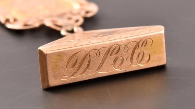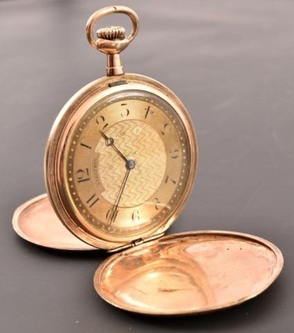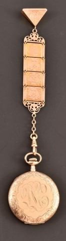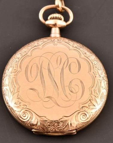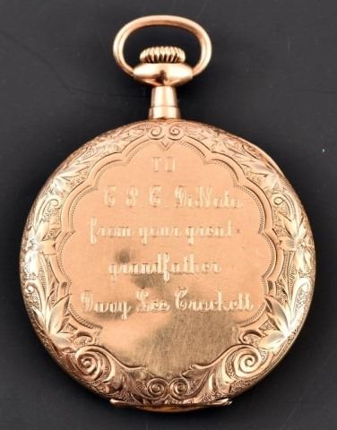 Gruen Watch Co. Verithin 16 jewel 25 year gold-filled pocket watch, with 10k gold engraved fob & chain dated 1913 with initials "D.L.C." Watch is engraved "to C.P.C. DiNoto from your great-grandfather Davy Lee Crockett"