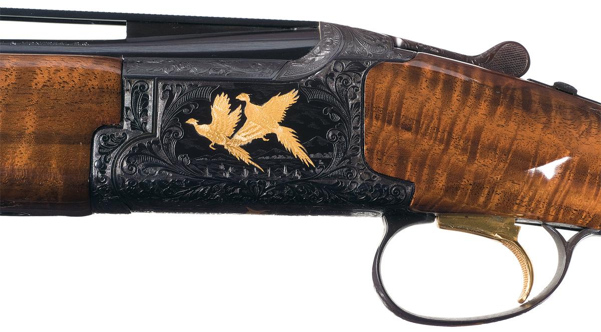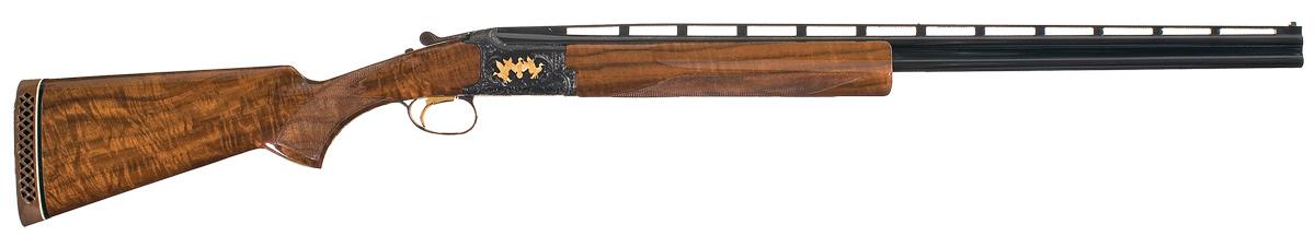 Manufactured by Miroku in Japan, this Browning shotgun features floral scroll engraving on the receiver, trigger guard, break lever, and forearm latch assembly. The left side of the receiver has two gold inlaid pheasants in flight, the right side has three gold ducks in a marsh scene, a gold inlaid setter on the bottom and a gold inlaid quail on the trigger guard. It is equipped with dual ivory bead sights on the high matte vent rib, 2 1/2" chambers, choked skeet/skeet and auto ejectors. Wide, checkered single selective gold washed trigger and tang safety. Mounted with high gloss finished fiddle back checkered walnut forearm and pistol grip stock with a Browning vented recoil pad. Pull is 14 3/8 inches, drop at the comb is 1 1/4", and the drop at the heel is 1 5/8".