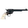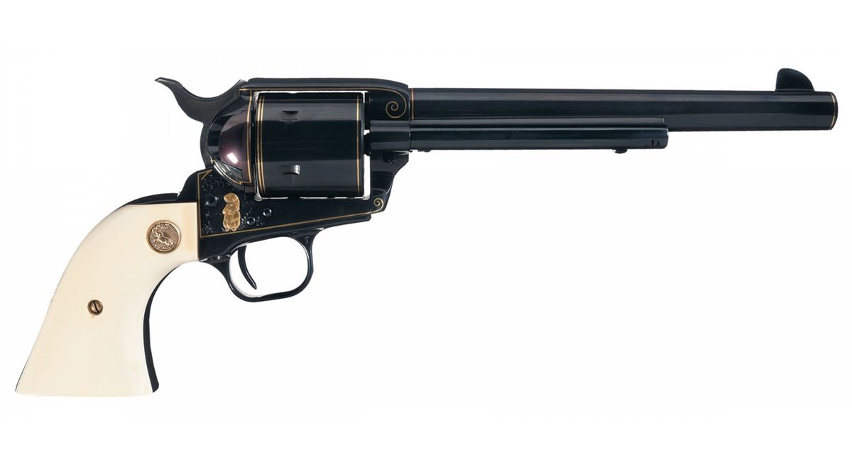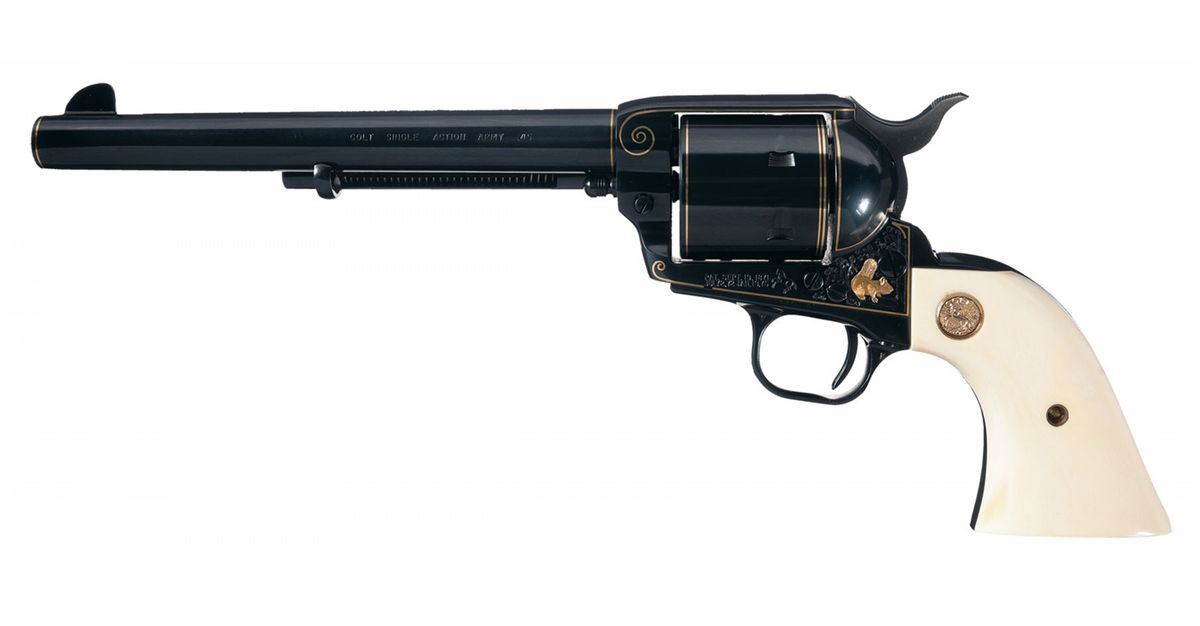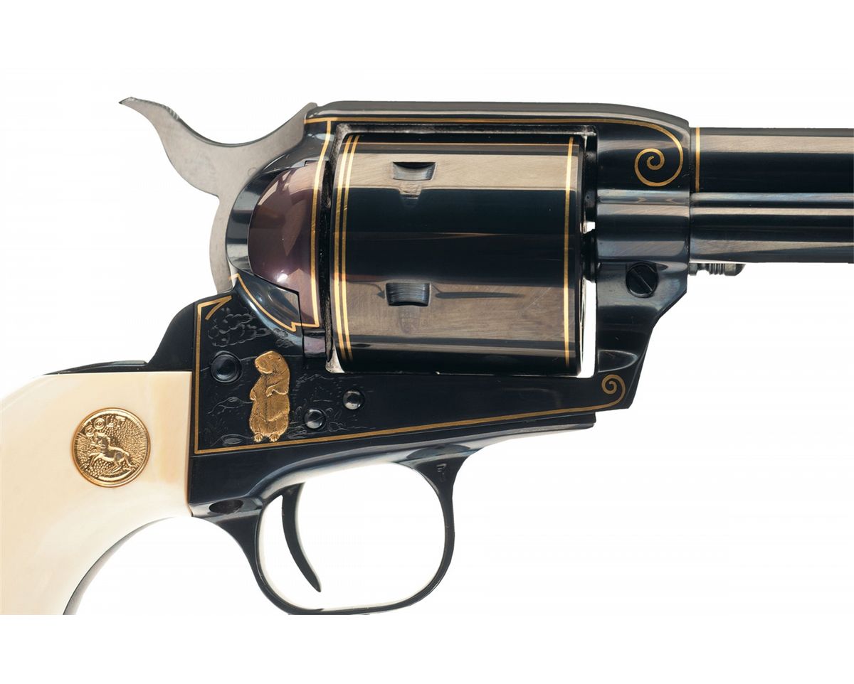 Manufactured in 1978. Gold inlaid thin band around the muzzle and breech ends of the barrel, single band around the front of the cylinder and double bands around the rear. The frame has decorative gold wire inlaid bordering as well as a gold inlaid squirrel on the tree branch on the left rear and a gold inlaid prairie dog in a plains scene on the right rear. The top of the barrel is marked with the one line address, COLT SINGLE ACTION ARMY .45" on the left side and the left side of the frame is marked with the two line, three patent dates followed by the Rampant Colt. The matching serial number is marked on the bottom of the frame and the left side of the grip straps under the grips. Blade front and frame notch rear sights, unfluted cylinder and fitted with smooth ivory grips with gold Colt medallions. The inside of each grip panel is marked "4068" and "C-26/AJE/INDIA".