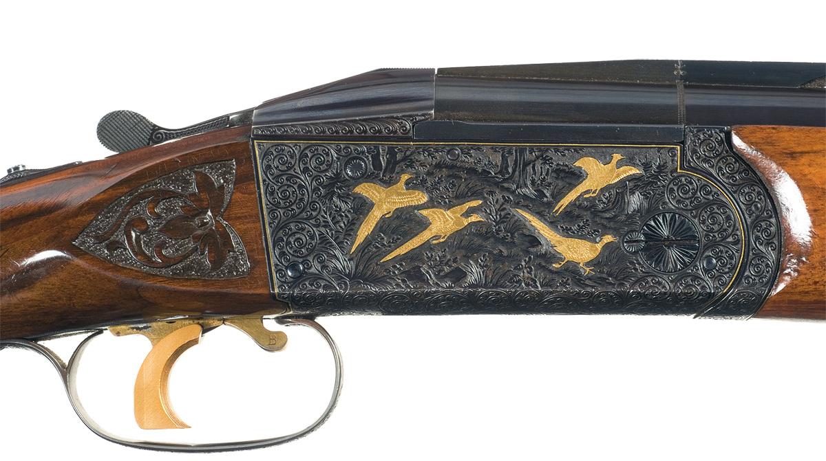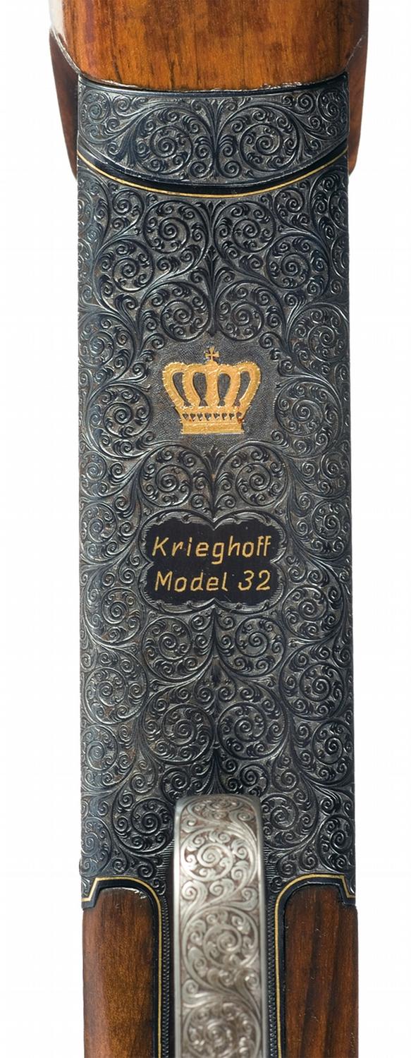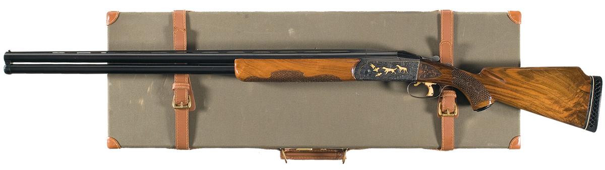 Introduced in the 1950s and discontinued in 1980, this two barrel set features one set of 30" and a set of 32" barrels, both with double bead sights on a matte vent rib, 3" chambers with ejectors. The 30" set is marked as being "F" full/"IM" improved modified and the other "F" full/"F" full. The receiver is engraved with a floral scroll design and four gold inlaid pheasants in a wooded scene on the right side, two gold inlaid hunting dogs scaring up three gold inlaid quail in a wooded scene and a gold inlaid crown and "Krieghoff / Model 32" on the bottom. The receiver is bordered with a simple gold inlaid wire border. The floral scroll design extends to the break lever, forearm hardware and trigger guard. Tang mounted safety, gold washed trigger, trigger shoe and selector mounted ahead of he trigger. The shotgun is mounted with extra fancy, nicely figured walnut forearm and pistol grip stock with floral and scale pattern carving on the forearm and stock flats and wrist, grip cap, raised comb and Pachmayr White Line vented recoil pad. Complete in a canvas covered hard case with combination lock, leather corner protectors and straps and padded hunter green lining. Length of pull is 13 3/4"