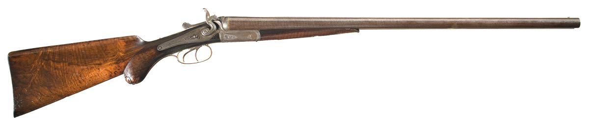 Condition: Fine. The barrels have a smooth brown-gray patina and retain approximately 80% of the Damascus pattern, with a couple minor dings. The left barrel has a bugle towards the muzzle. The remaining metal surfaces have a mottled gray patina with traces of silvered out case colors in the protected areas found on the frame and lock plates. The engraving is clear. The wood is good with a few absent chips (mostly on the forearm), worn smooth checkering, and numerous minor handling marks. There is some crazing on the buttstock and a sling swivel stud has been removed.