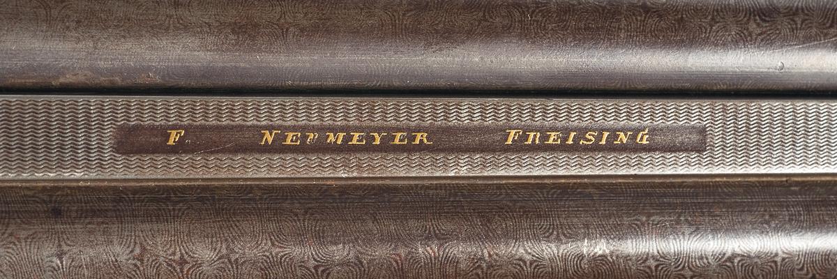 Single bead sight on a solid rib marked "F. NEUMEYER FREISING" in gold, with double gold bands on the Damascus barrels at the breech. 2 1/2" chambers, choked full/modified, extractor. Crown/letter proofs on the water table and barrels, including the nitro proof. The frame, trigger guard, lock plates, and hammers feature a light scroll engraving. Checkered forearm with horn insert and checkered pistol grip stock with cheekpiece, metal shotgun buttplate, and floral carved accent on the pistol grip. Length of pull is 13 3/4".