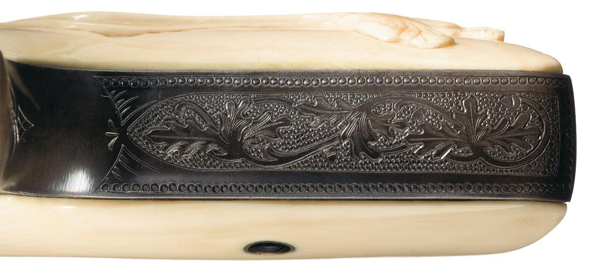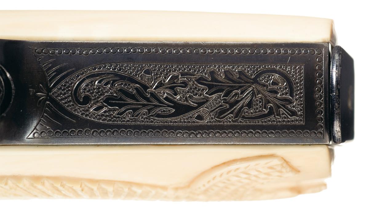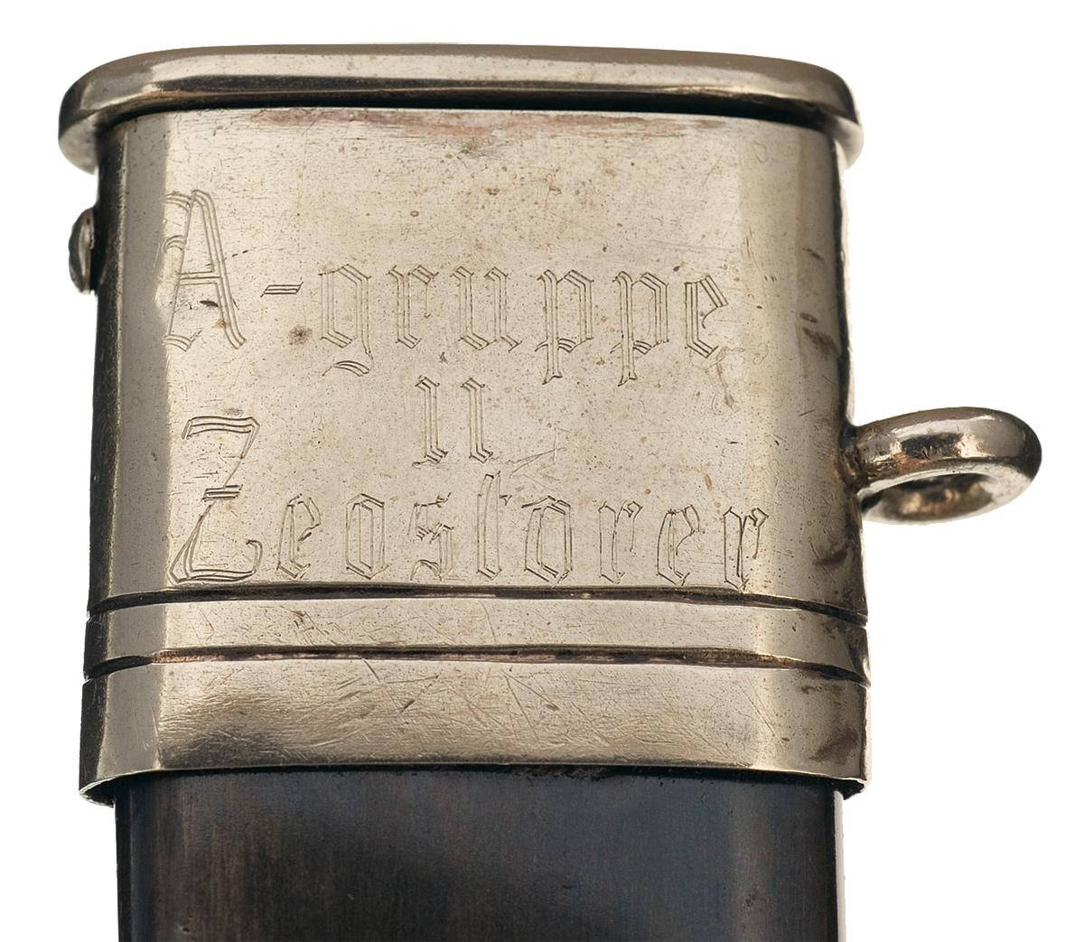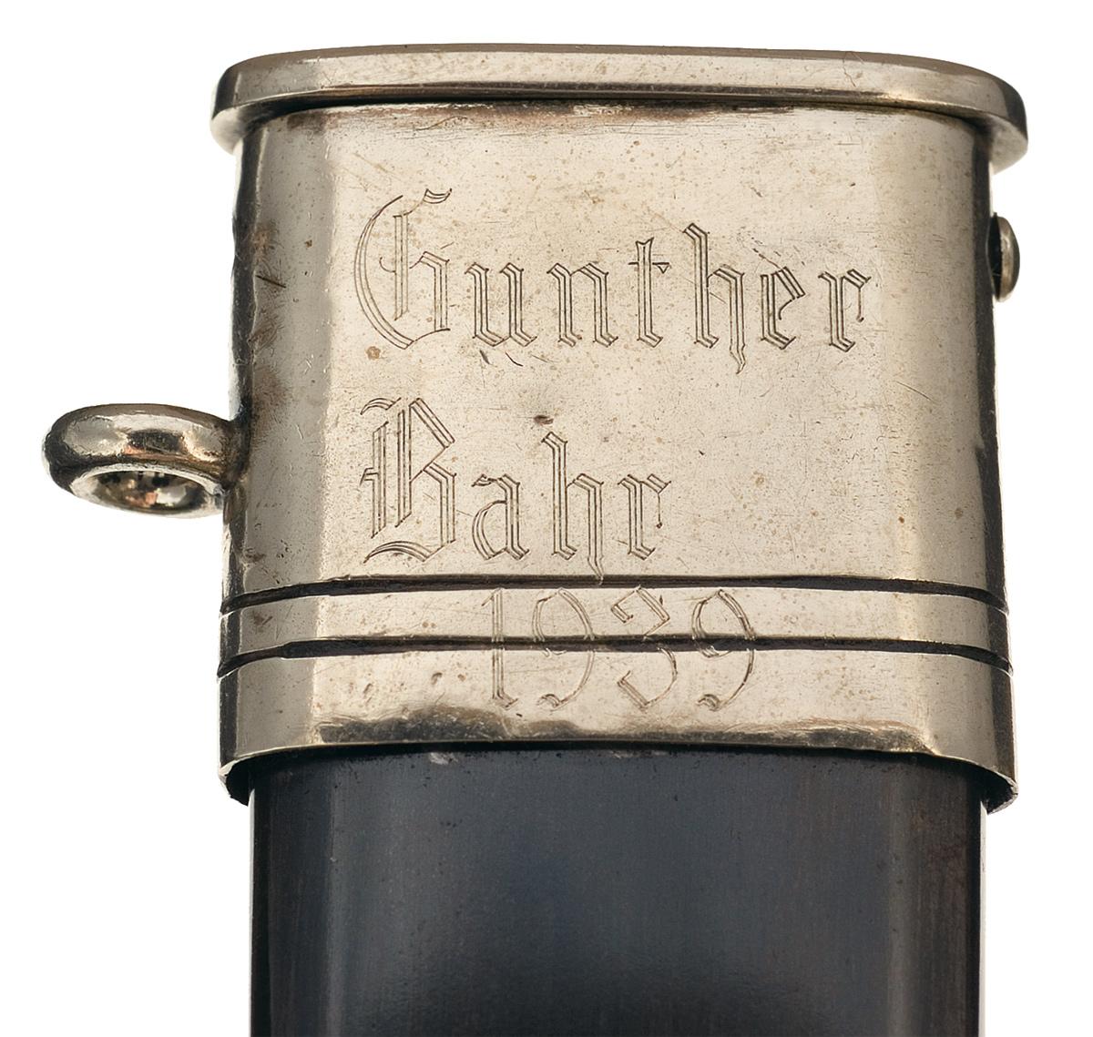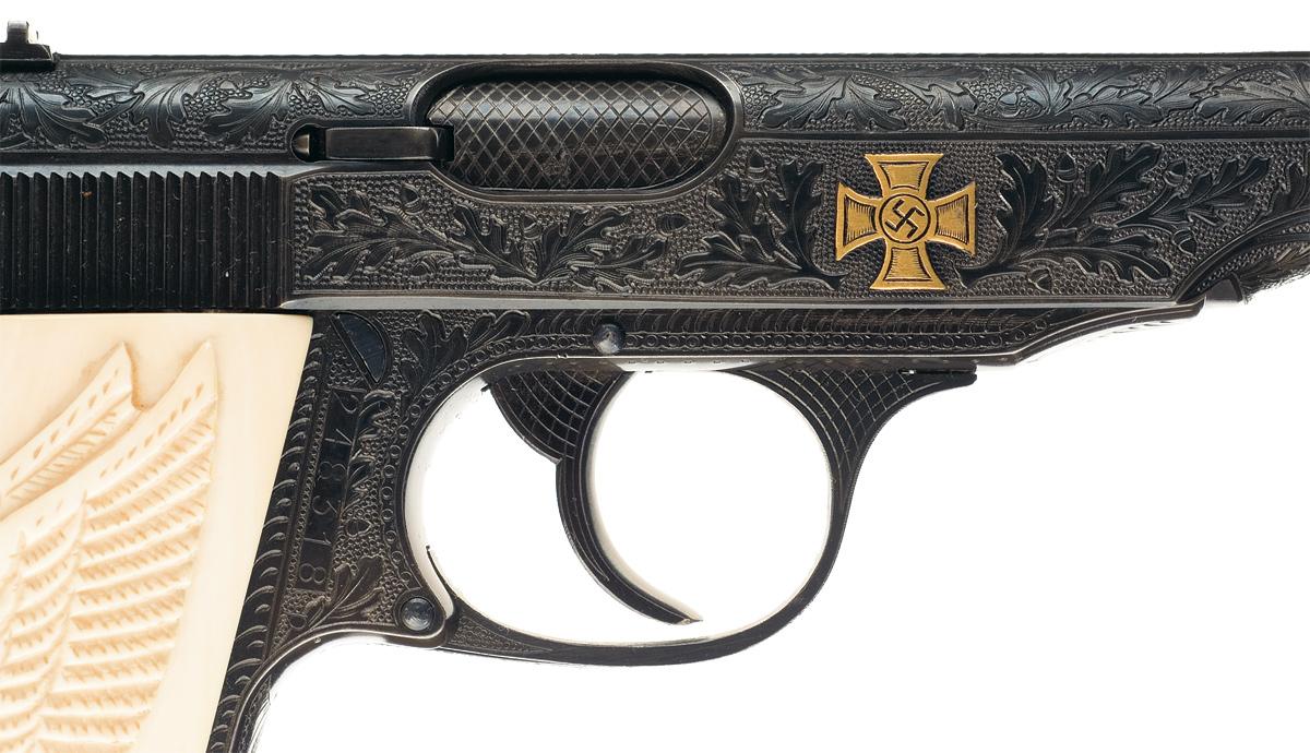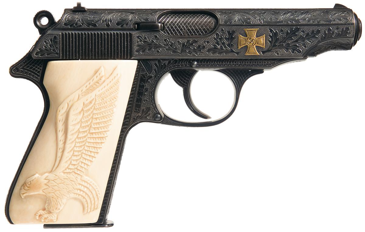 Wartime production, artisan engraved Walther Model PP pistol with gold inlay and carved ivory grip and presentation National Socialist Flying Corps (NSFK) dagger with engraved scabbard. The .22 caliber Mod. PP pistol has a 60-degree safety lever and magazine release on the frame. The pistol is factory engraved with oak leaves and acorns on a punch-dot background. The engraving covers the entire pistol. The exposed portion of the barrel is blued and decorated with engraved cross-hatching. The right side of the slide has a gold relief Iron Cross with a swastika in the center surrounded by a wreath of engraved oak leaves. The two-piece grips are ivory. The right grip is relief carved with a stylized diving eagle. The left side of the slide has the Walther Banner, the two-line legend and "Mod. PP" on relief panels surrounded by oak leaves and punch-dots. Wartime "Eagle/N" proofmarks are stamped on the right side of the barrel chamber and muzzle. The serial number, "248318" is located on a vertical oval panel on the right side of the frame. The magazine is un-marked and has a phosphate finish. The NSFK Dagger has a silver-plated pommel and hilt with black enamel swastikas between the wing-shaped counter guards and ivory grip. The 6 3/4-inch spear-point blade is etched with the oval "E&A HELBIG/STEINBACK" proofmark on the reverse. The dagger has a blued steel body with silver-plated throat. The obverse of the throat is engraved: "Gunther/Bahr/1939". The reverse side of the scabbard throat is engraved: "A-gruppe/II/Zeostorer" in three lines. The pistol and dagger are complete with a copy of a Capture Certificate dated Nov., 2, 1945. The certificate states that T/S J.E. Ford was authorized to retain "Walther pistol #248318 engraved" and "German dagger".