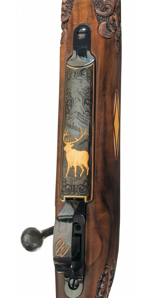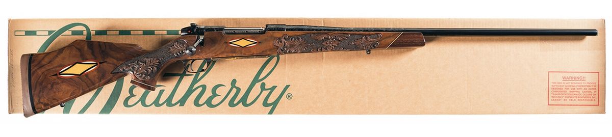 Manufactured in the U.S.A. The breech end half of the barrel, receiver and the rear of the bolt assembly are engraved with a board leaf scroll design. The trigger guard has a gold inlaid "W", and the floor plate has a gold inlaid elk in a mountain field scene, with a floral scroll design above and below the scene and a gold inlaid band border. The barrel was manufactured without sight provisions and is marked "USE ONLY/300 WBY MAG" on the left rear. The left side of the receiver is marked "MARK V", "Weatherby/ATASCADERO, CA" and "MADE IN U.S.A.". The top of the receiver is drilled and tapped for scope/rear sight mounting, jeweled bolt and follower, and mounted with a nicely figured deluxe high gloss walnut stock with relief carved floral carving on the wrist and forearm with a stippled background. The forend and grip cap have contrasting wood and there is a triangle in an oval featuring four contrasting wood shades on each side at the receiver and a larger one on the right side of the buttstock. Cheekpiece, high comb, decelerator recoil pad and sling swivel studs. Comes with the original box numbered to the gun.