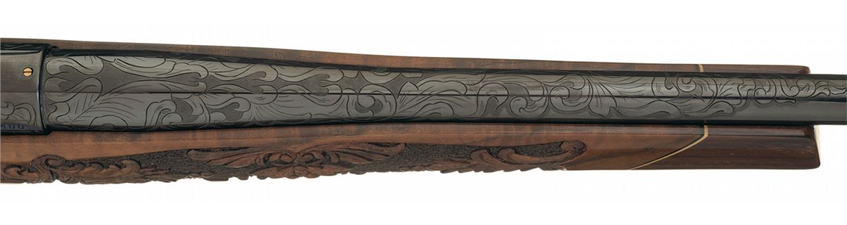 Very fine as custom embellished. The rifle retains virtually all of the blue finish showing only the slightest handling/storage marks. The engraving remains sharp and all of the gold inlay remains. The stock is excellent with some crazing beginning to develop immediately ahead of the bolt handle, otherwise only light handling/storage marks and sharp carving. The markings are crisp and clear. The action is fine. The box is excellent.