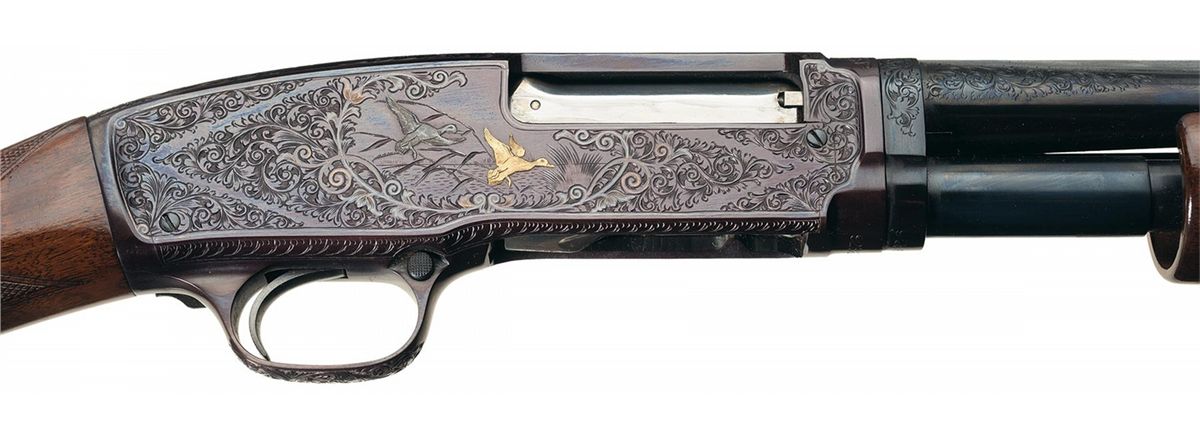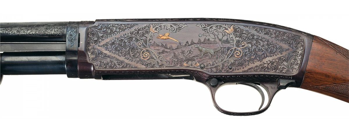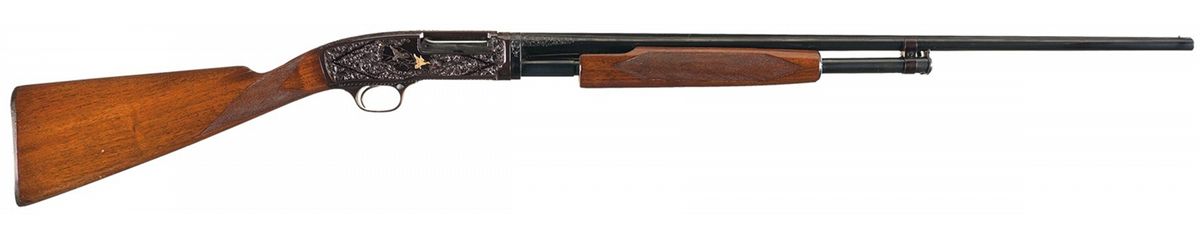 Engraved Gold and Silver Inlaid Winchester Model 42 Slide Action Shotgun with Solid Rib and Straight Grip Stock