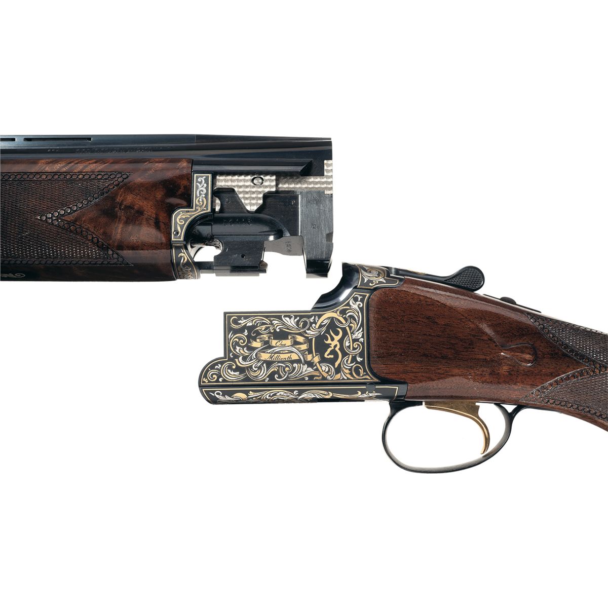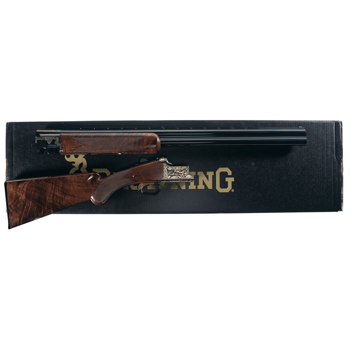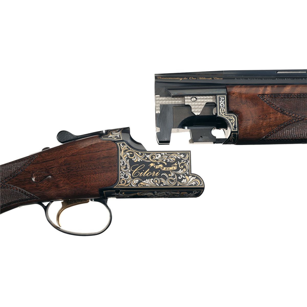 This is 1 of a limited edition of 500 shotguns commemorating the making of the one millionth Citori shotgun in 2008. These shotguns were serial numbered in a special range, 081000001 through 081000500. Dual ivory bead sights on the matte vent rib, 3 inch chambers, with ejectors and Invector Plus choke system, (full/modified chokes installed). In addition to the standard barrel markings, the upper right side at the breech is marked "Commemorating the One Millionth Citori" in gold script. The action, trigger guard, break lever and forearm hardware are engraved with silver and gold highlighted floral scroll designs. In addition the left side of the action has a gold banner with black lettering reading "One/Millionth" followed by a gold accented Browning Buck in a gold highlighted oval. The right side has a similar banner and a gold "Citori", and the bottom is marked in gold "The Best / There Is". Gold washed single selective trigger, tang mounted safety/selector and mounted with extra fancy checkered walnut forearm and round knob pistol grip stock with a special dot cut bordering, teardrop flats, black plastic Browning buttplate and silver initial oval. Complete with the original box numbered to the gun, papers, one additional choke tube and choke tool. Length of pull is 14 3/8 inches.