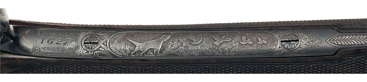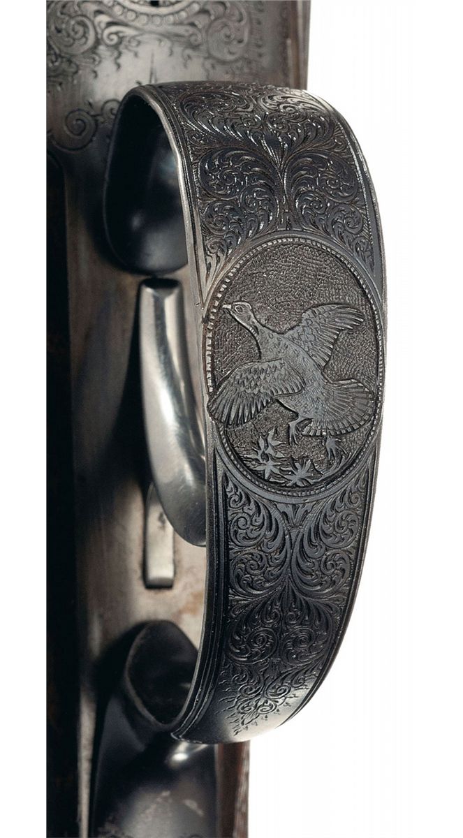 Two white bead sight on the solid matte rib, both chokes gauge at over cylinder and 2 3/4 inch chambers with lengthened forcing cones and ejectors. The top of the right barrel is engraved "GRIFFIN & HOWE, INC." and the left barrel is engraved "NEW - YORK". The underside is engraved "MADE IN GERMANY" and is stamped "KRUPP -- LAUFSTAHL". The bottom flat has "crown/W" and "crown/U" proofs with the gauge marking "20" and chamber length "70mm". The left side of the receiver has deep relief engraving of three grouse in a wooded scene with the underside having floral scroll and rose bouquet and the right side has a dog and two quail in a wooded scene. There are oak leaf and acorn designs on the fences and there is a grouse on the trigger guard with a dog and 4 quail in flight on the lower tang. Mounted on a beautifully figured Circassian walnut forearm with multi-point checkering and ebony tip and a straight grip stock with ebony tear drops inlaid at the wrist, silver initial oval engraved "HB" and checkered butt with steel toe and heel plates. Length of pull is 13 1/2 inches.