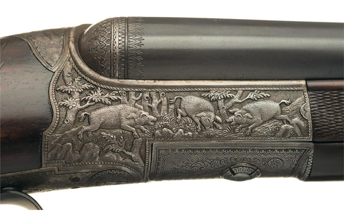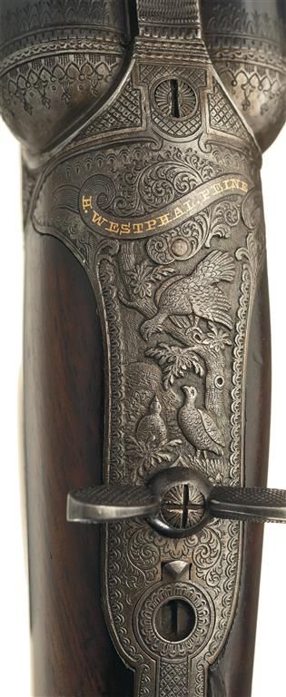 Single brass bead sight on the solid matte rib, 2 3/4 inch chambers, choked extra full/extra full with extractor. Deep relief wooded game scene engraved action, "H. WESTPHAL. PEINE" inlaid in gold on top of the frame, scroll engraved trigger guard with relief engraved monogram, horn trigger guard grip extension and barrel release. Mounted with a multi-point checkered walnut forearm with scroll engraved forend cap and straight grip stock with cheek piece, engraved buttplate with compartment for a three piece cleaning rod, (not included) and sling swivel. Length of pull is 13 3/4 inches.