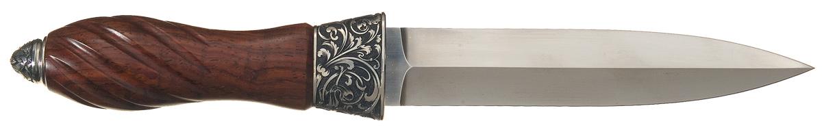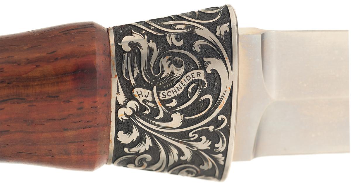 This is an example of an engraved boot knife handcrafted by legendary knifemaker Herman J. Schneider. The knife features a 6 inch double edged blade. The bolster has a scroll engraving on a black punch dot background with "H J SCHNEIDER" marked in a banner on a side. The pommel is adorned with an engraved floral blossom on a black punch dot background. The nicely figured hardwood handle features fluting from the mid-point to the butt. OAL: 11"