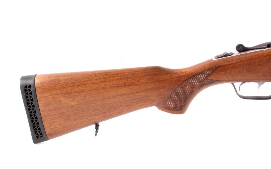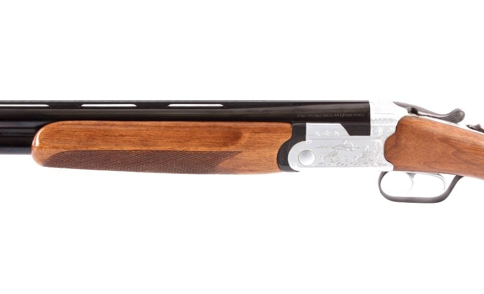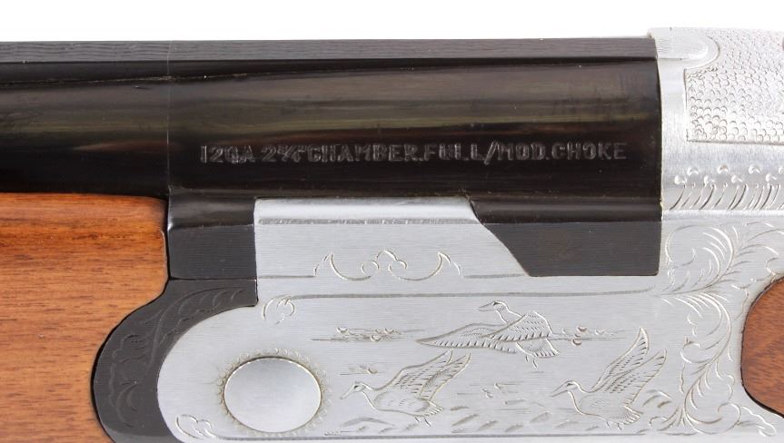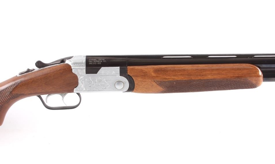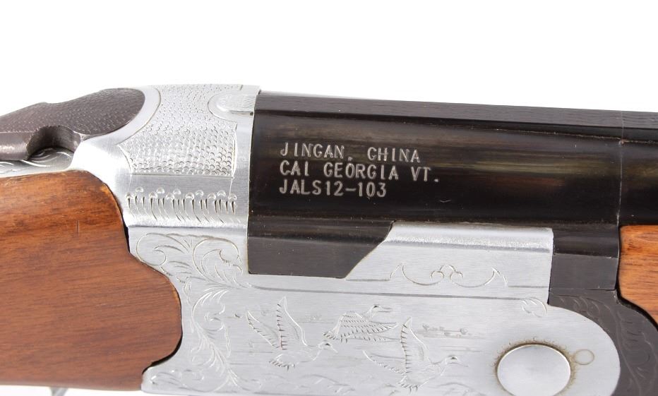 This is a Hiongshi O/U factory engraved shotgun chambered for 12 gauge. The shotgun has a blue'd steel vented rib barrel with a bright finished receiver and premium deluxe solid walnut hardwood checkered stocks. The receiver shows wonderfully engraved ducks on each sides with the bottom being marked "Hiongshi". The right side of the barrel is marked "Jingan China CAI Georgia VT. JALS12-103" and the left side is marked "12GA 2 3/4" Chamber Full/Mod. Choke". The shotgun is in good condition. It measures 45.75" long overall with a 29.5" barrel. Serial number is 00K0779. This firearm requires an FFL Transfer or a NOCS Background Check.