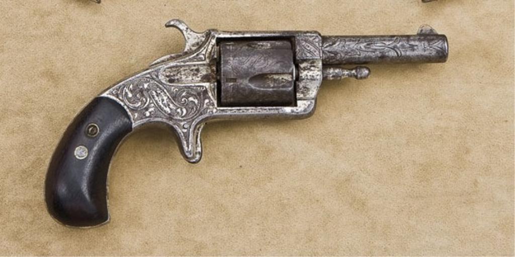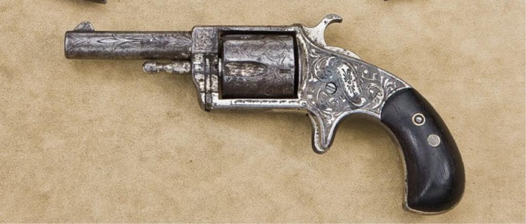 Engraved Hopkins and Allen Blue Jacket No. 2 spur trigger antique revolver, .32 cal., 2-3/4” round barrel, nickel finish, wood grips, #X978. This gun is in overall good condition showing approx. 35% original nickel finish with the balance of the metal surfaces showing an un-cleaned dark patina; the markings are sharp, the action good, the period engraving of the New York style and better quality/more profuse than usually seen on these circa 1870’s-1880’s spur trigger revolvers; good wood grips with a secondary escutcheon and dark bore. Est.: $300-$600.