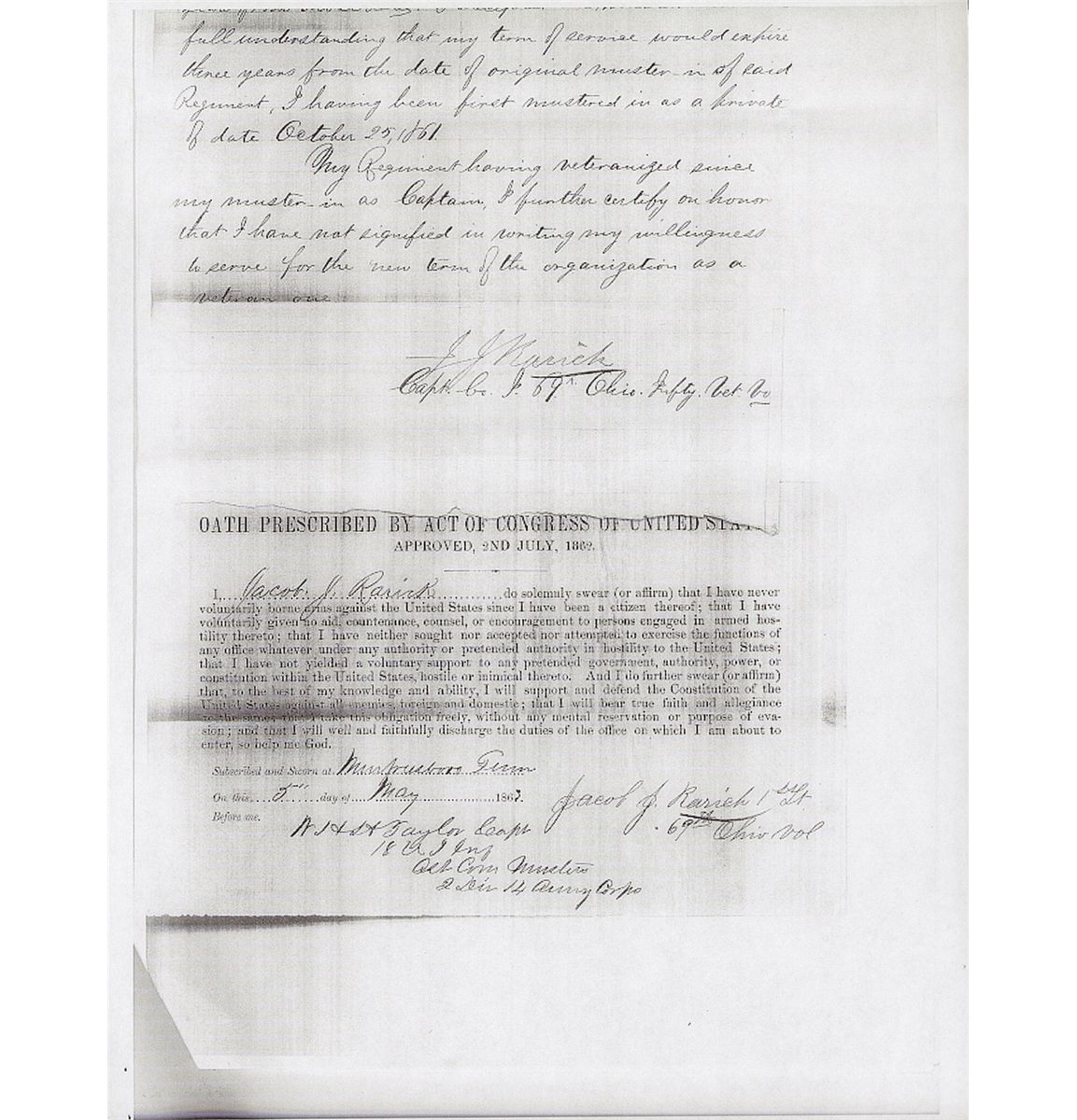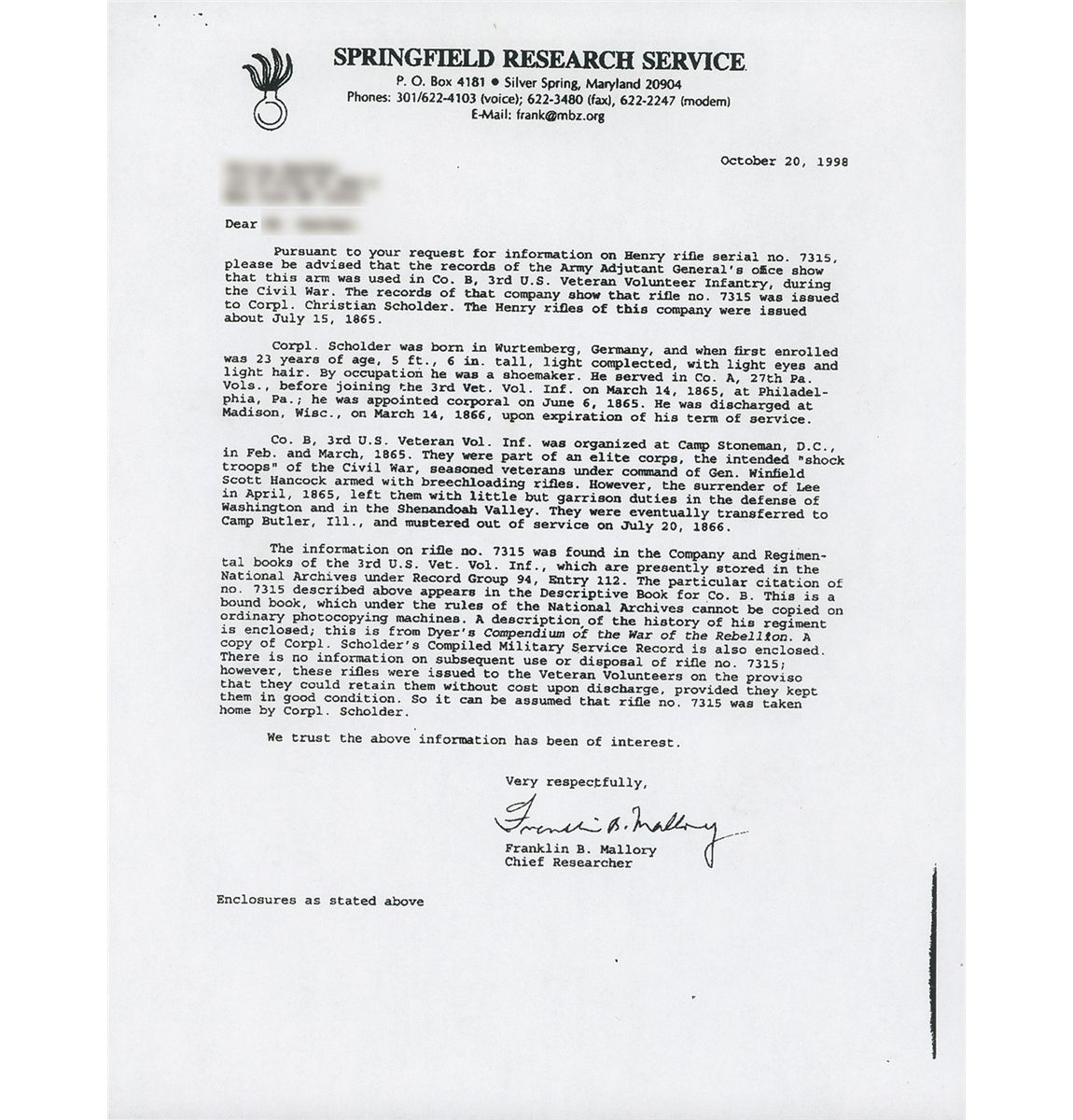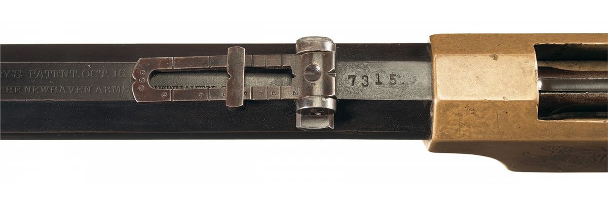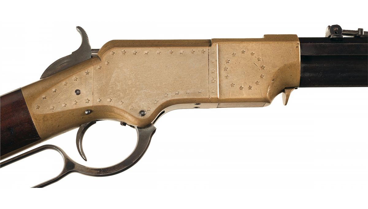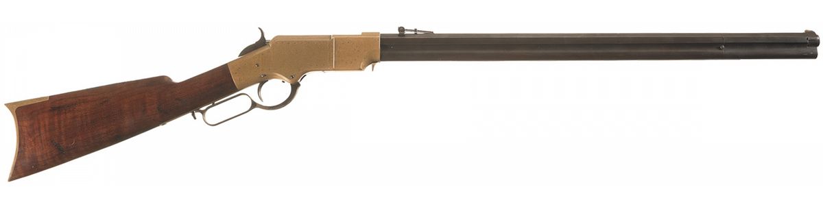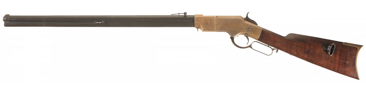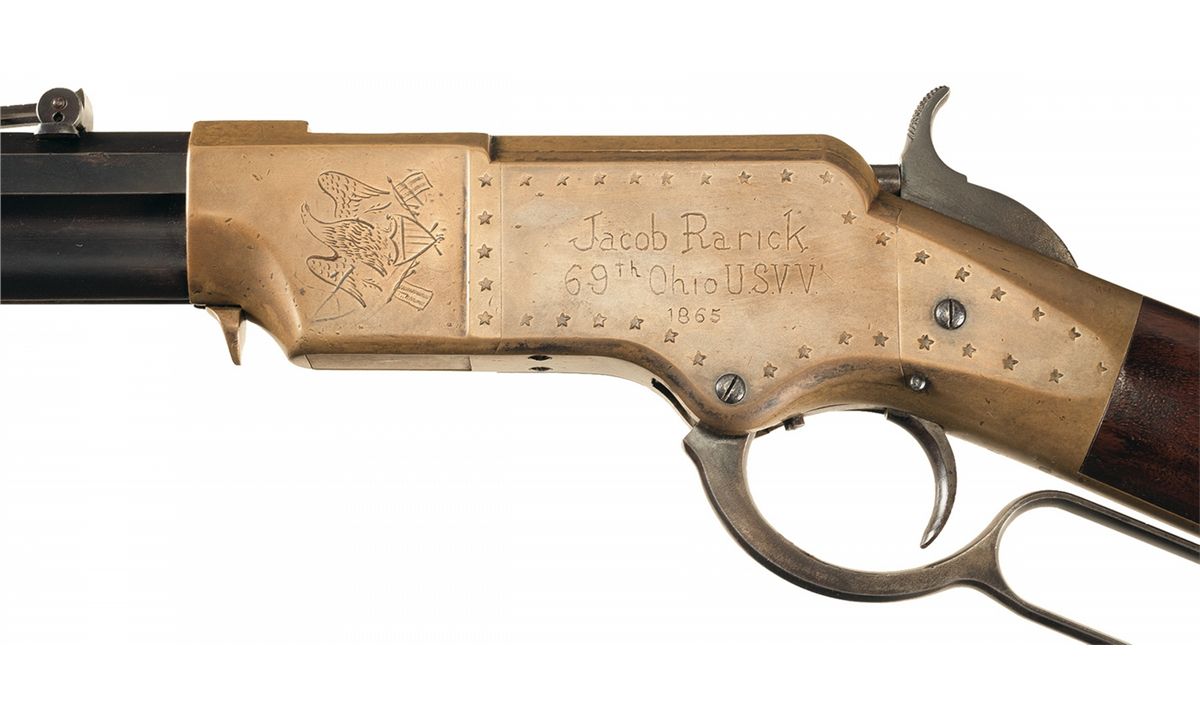 Marked "HENRY'S PATENT OCT. 16, 1860/MANUFACT'D BY THE NEWHAVEN ARMS CO. NEWHAVEN CT." on the top barrel flat ahead of the rear sight and the re-stamped serial number is marked on the top flat at the breech. The left side front of the receiver is engraved with a eagle, shield and flags motif (horizontal to the barrel) and "Jacob Rarick/69th Ohio U.S.V.V./1865" on the left side plate. The rear portion of the frame is bordered by stars. The right front of the receiver has a circle of stars and the remainder has the same star bordering. Brass blade front sight, folding ladder rear sight graduated to 900 yards, sling swivel in the left side of the barrel and stock, and mounted with a smooth straight grip walnut stock with a brass crescent buttplate. With the gun are copies of military information on Jacob Rarick including an "Oath of Allegiance" "Oath Prescribed By Act Of Congress Of United States" and muster records.