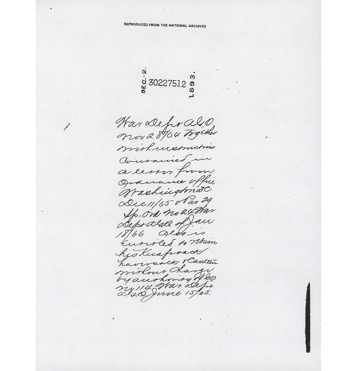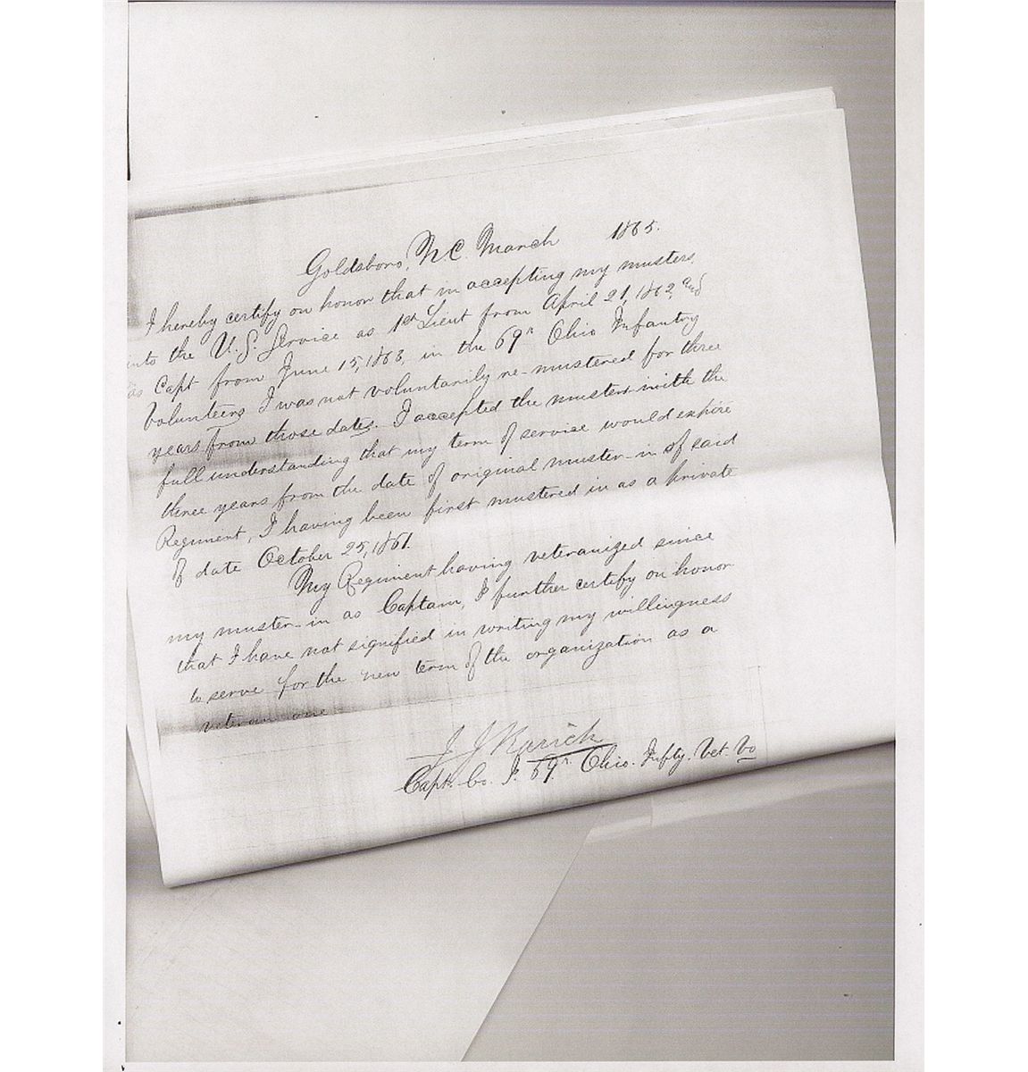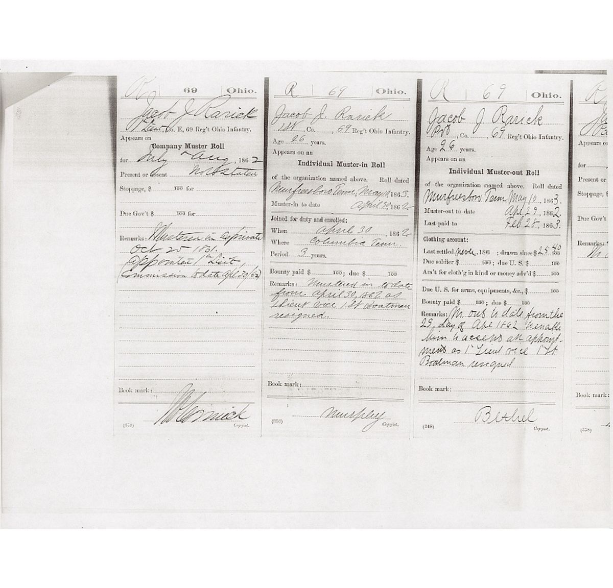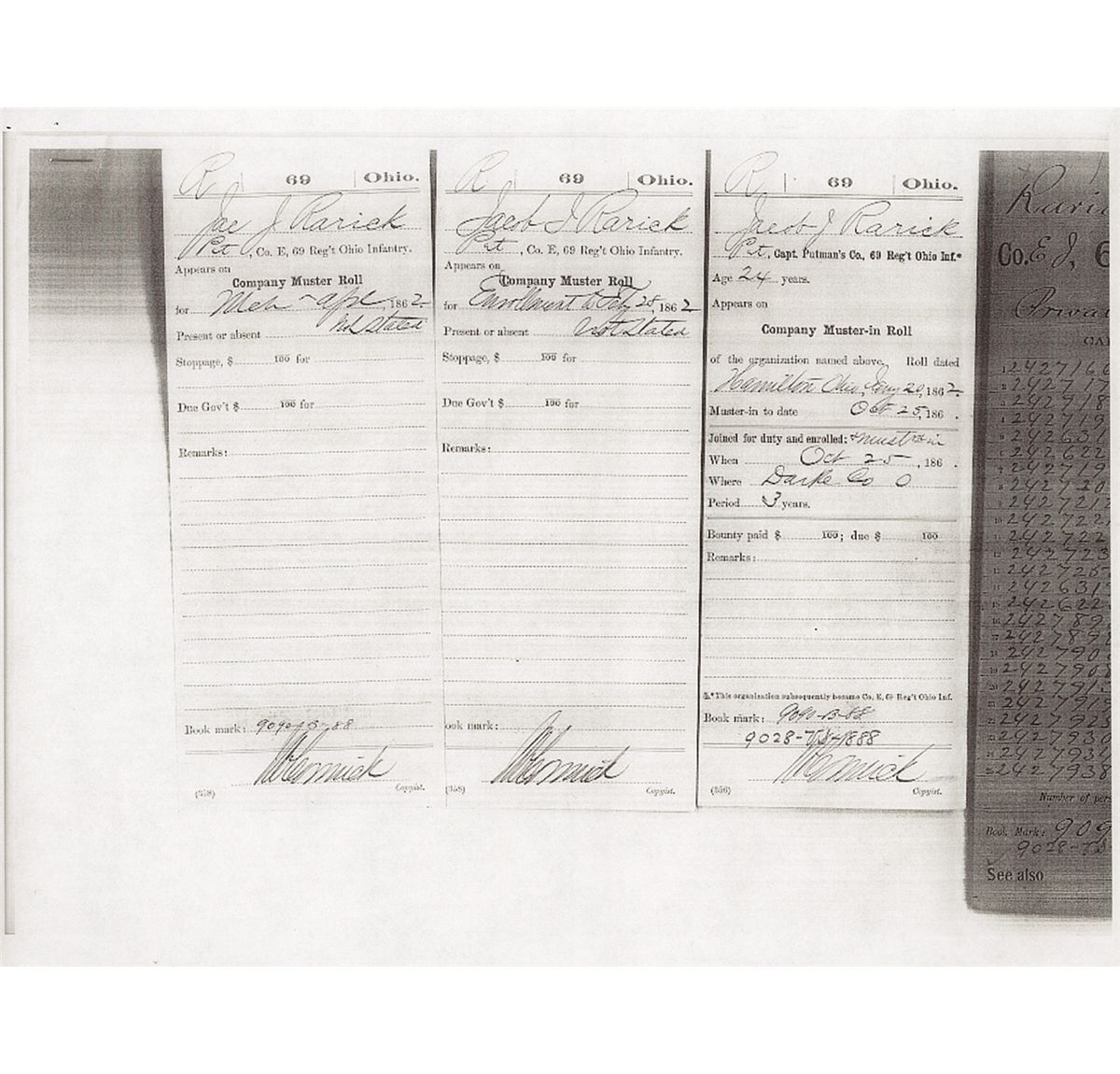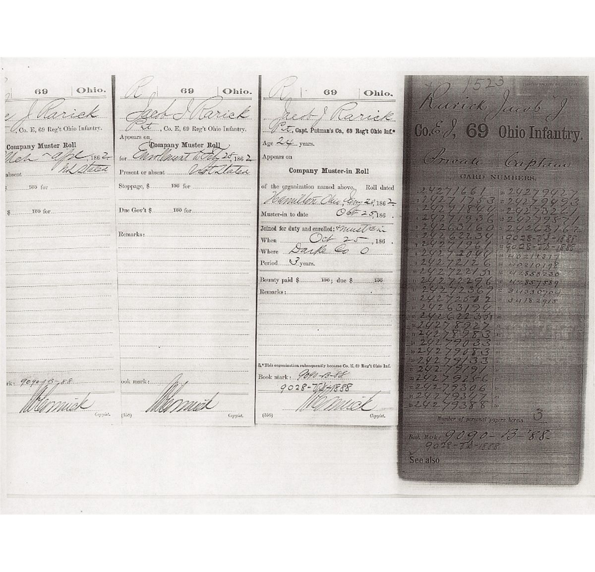 Marked "HENRY'S PATENT OCT. 16, 1860/MANUFACT'D BY THE NEWHAVEN ARMS CO. NEWHAVEN CT." on the top barrel flat ahead of the rear sight and the re-stamped serial number is marked on the top flat at the breech. The left side front of the receiver is engraved with a eagle, shield and flags motif (horizontal to the barrel) and "Jacob Rarick/69th Ohio U.S.V.V./1865" on the left side plate. The rear portion of the frame is bordered by stars. The right front of the receiver has a circle of stars and the remainder has the same star bordering. Brass blade front sight, folding ladder rear sight graduated to 900 yards, sling swivel in the left side of the barrel and stock, and mounted with a smooth straight grip walnut stock with a brass crescent buttplate. With the gun are copies of military information on Jacob Rarick including an "Oath of Allegiance" "Oath Prescribed By Act Of Congress Of United States" and muster records.