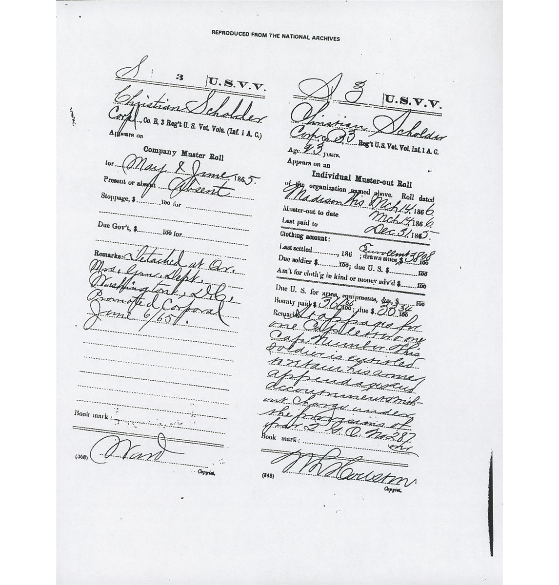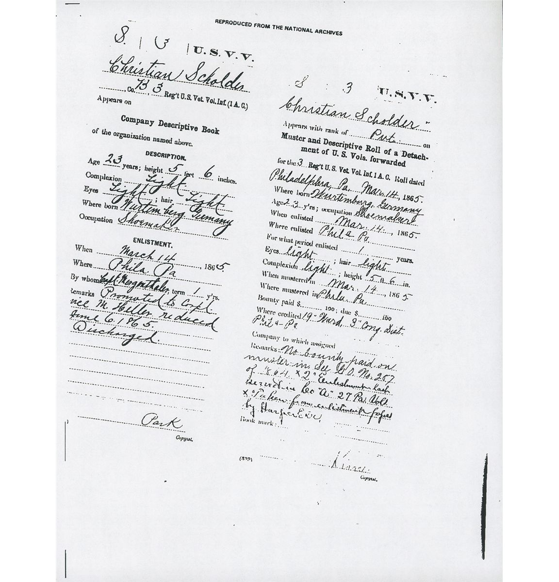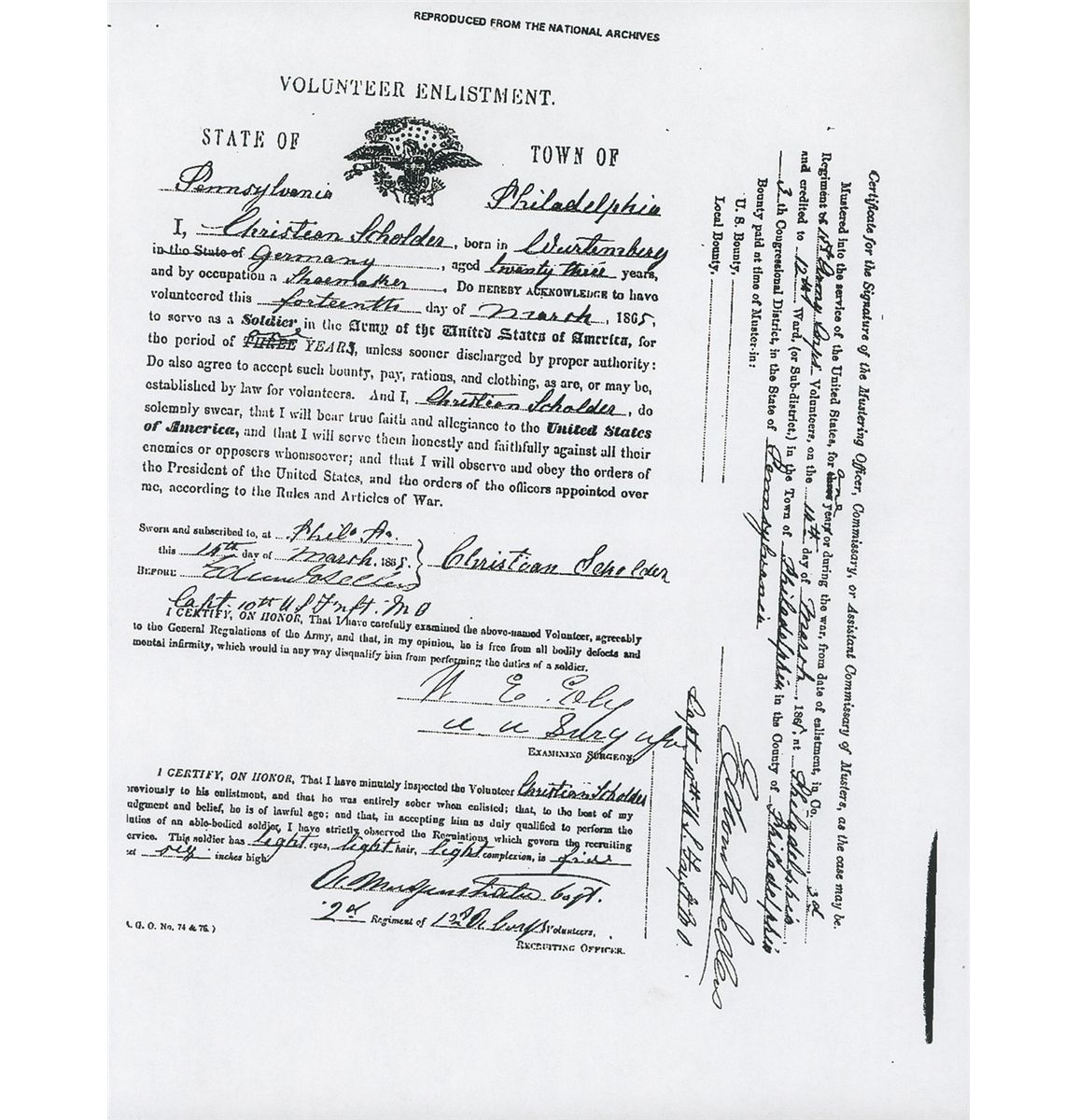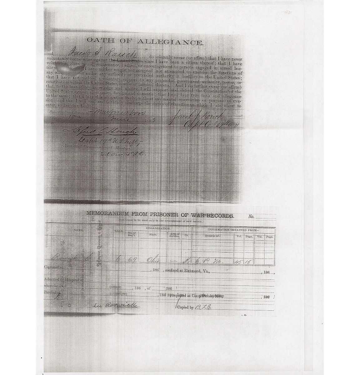 Marked "HENRY'S PATENT OCT. 16, 1860/MANUFACT'D BY THE NEWHAVEN ARMS CO. NEWHAVEN CT." on the top barrel flat ahead of the rear sight and the re-stamped serial number is marked on the top flat at the breech. The left side front of the receiver is engraved with a eagle, shield and flags motif (horizontal to the barrel) and "Jacob Rarick/69th Ohio U.S.V.V./1865" on the left side plate. The rear portion of the frame is bordered by stars. The right front of the receiver has a circle of stars and the remainder has the same star bordering. Brass blade front sight, folding ladder rear sight graduated to 900 yards, sling swivel in the left side of the barrel and stock, and mounted with a smooth straight grip walnut stock with a brass crescent buttplate. With the gun are copies of military information on Jacob Rarick including an "Oath of Allegiance" "Oath Prescribed By Act Of Congress Of United States" and muster records.