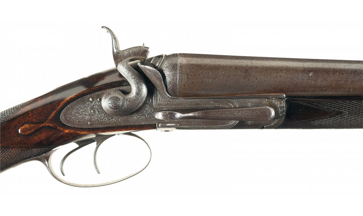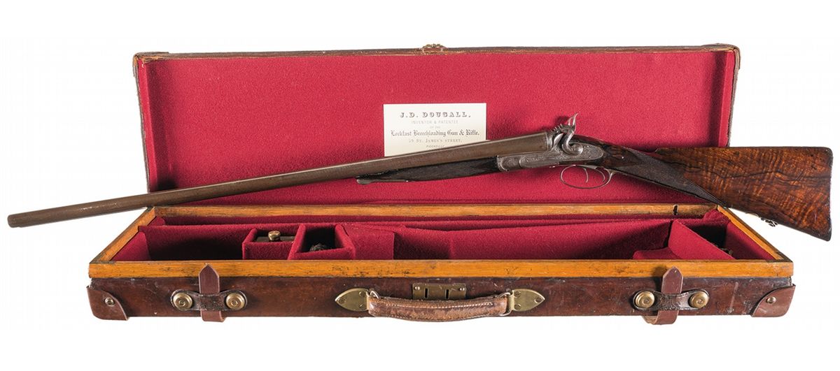 Manufactured between 1864 and 1882. The side plates, hammers, receiver, side lever, trigger guard, heel and toe plates, and forearm hardware have extensive tight floral scroll engraving. The top tang between the hammers is engraved with the badge of The Prince of Wales. The bottom of the receiver is engraved "J.D.DOUGALL/PATENT LOCK FAST". The top of the matted solid rib is engraved "J.D. DOUGALL GUN & RIFLE MANUFACTURER TO H.R.H. THE PRINCE OF WALES, 59 ST. JAMES'S ST. LONDON". The barrels have a single steel bead sight, are choked .005/.023 and have 2 3/4 inch chambers with an extractor. Mounted on a beautifully figured, multi-point checkered walnut forearm and straight grip stock with blank initial oval, sling swivel, and heel and toe plates with a checkered bare butt. Length of pull is 13 7/8 inches. With a leather covered oak takedown hardcase with J.D. Dougall label, two-piece cleaning rod, bore brush, patch jag, empty bottle of Rangoon oil, pull through bore cleaner and screwdriver.