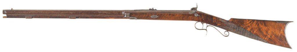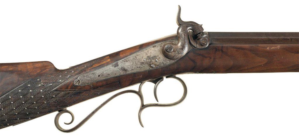 Back action percussion rifle manufactured in the second half of the 19th century with barrel turned down at the muzzle for a starter and fitted with blade front and adjustable notch rear sights.
