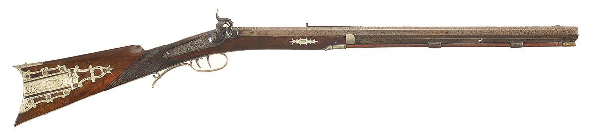 Engraved patch box, action and trigger guard (cracked), "J. Watt" marked lock plate, rear sight missing elevator. Gold inlaid bands at the breech and silver mountings.