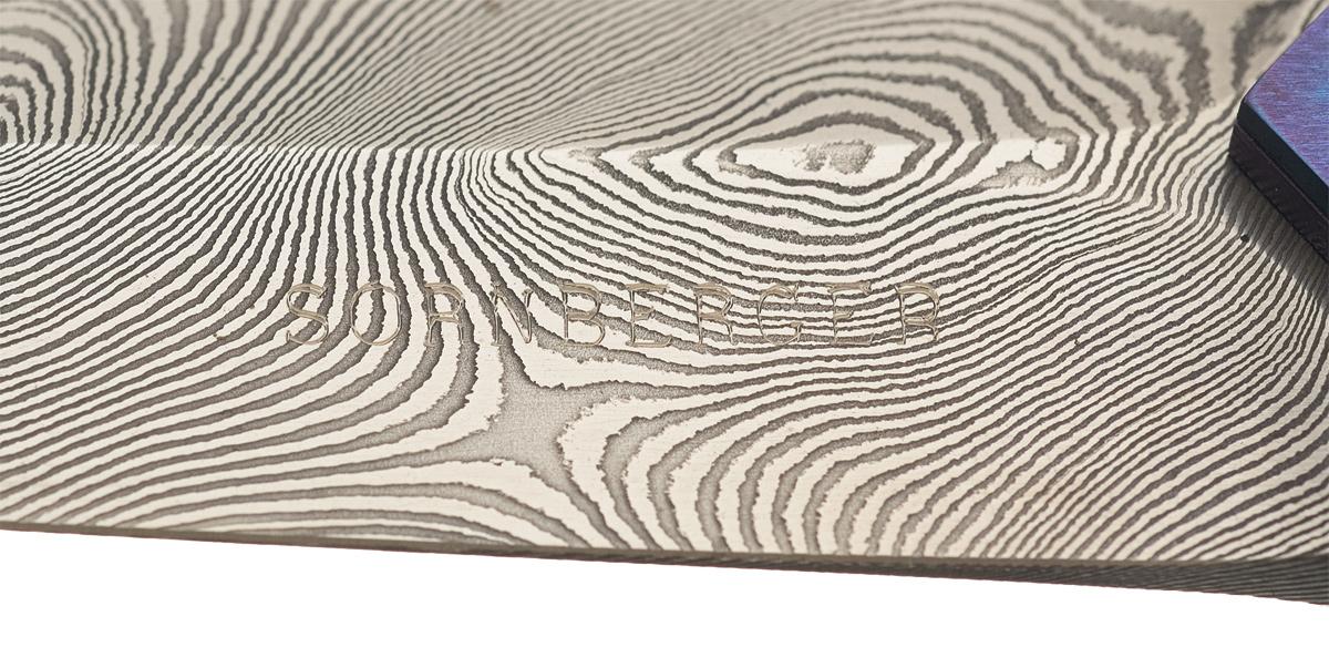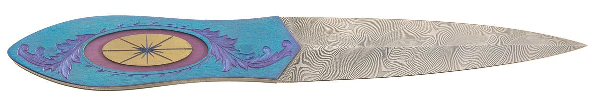 This boot knife was fabricated by Jim Sornberger who is a Knifemakers' Guild member from Volcano, California and is known for using a variety materials for his handles. The Damascus blade is 5 inches long and marked "SORNBERGER". The scales are constructed out of two contrasting finished pieces of titanium that are fitted to the Damascus tang, giving the handle a unique multi-colored appearance. The first piece of titanium has a blue metallic finish and is engraved with purple metallic finished floral wedges that flank an oval cut-out. The oval cut-out exposes the second piece of titanium which has a purple metallic finish. The star burst engraved oval in the center of the cut-out has metallic gold finish. OAL: 9 1/4".