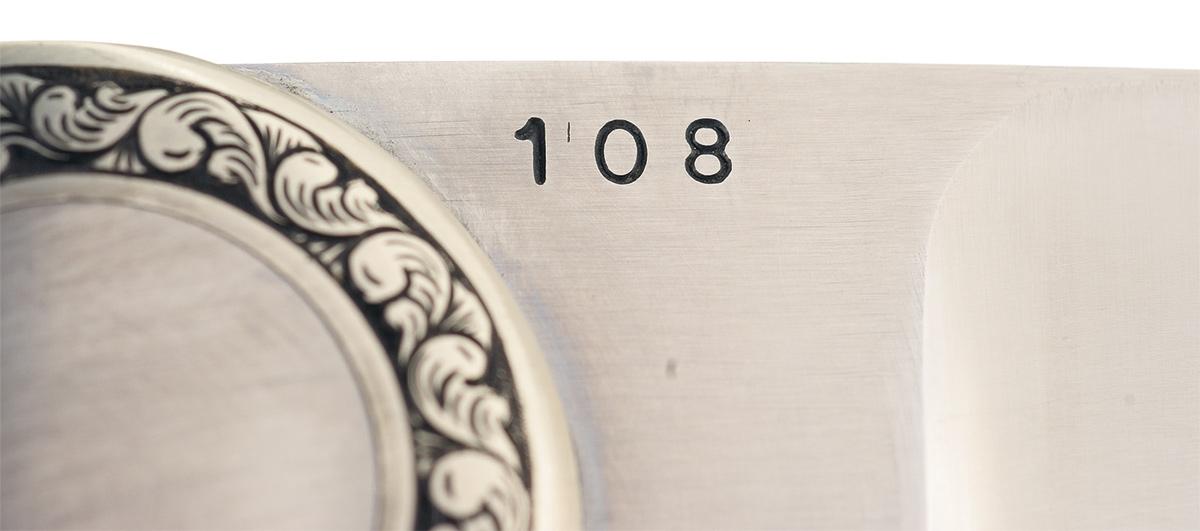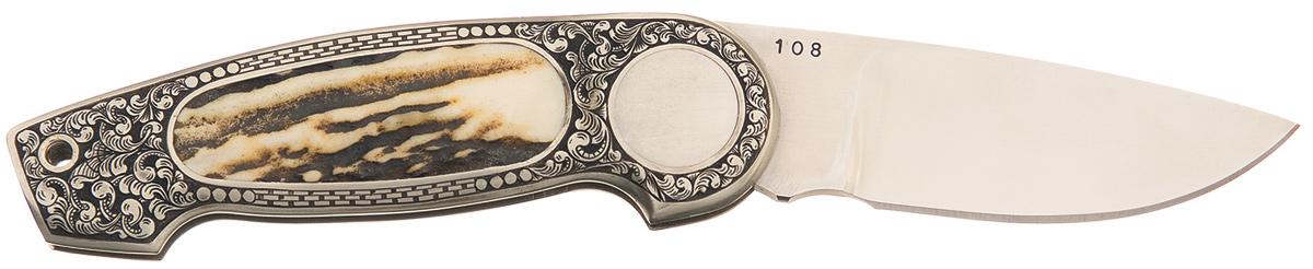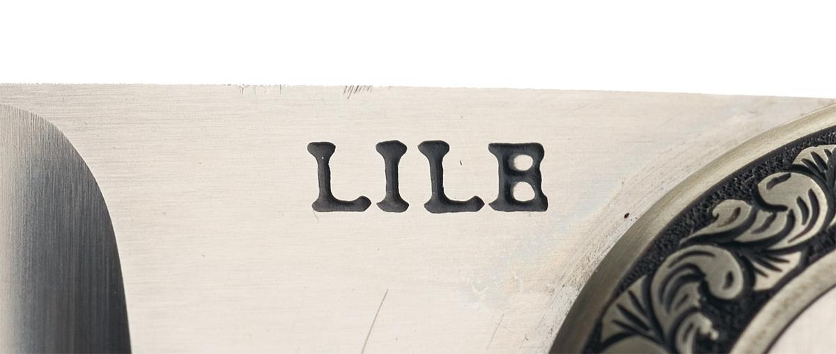 This folding knife was handcrafted by the late Arkansas Master Knifemaker James B. Lile. One of the most influential knifemakers in the world, Lile is the inventor of the famous "Lile Lock" folding knife and is probably best remembered as the creator of the original Rambo knife for the movie "First Blood" which generated a whole new era of knife design and collecting. His customers included Presidents Richard M. Nixon, Gerald R. Ford and Ronald Reagan, King Carl Gustav IV of Sweden and the actors John Wayne and Fess Parker. This Lile folding knife has a 2 1/2 inch blade marked "LILE" on the left ricasso and the number "108" on the reverse. The inside of the frame has a U.S. patent number dated 1987. The silver frame has a scroll engraving with a dot and thick dash engraved motif flaking the stag inlays. OAL: 6 1/4".