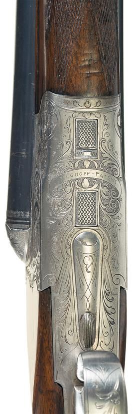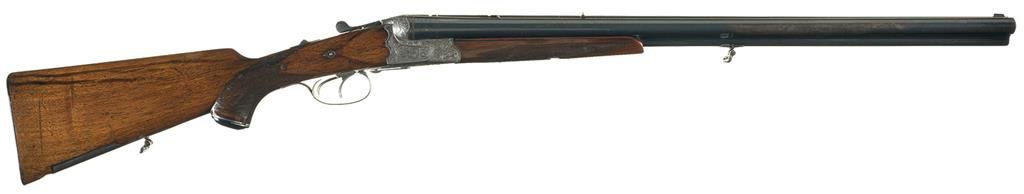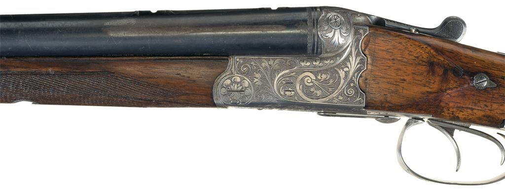 This example has extensive expertly executed floral scroll engraving with a punch dot background on the receiver. The trigger guard, trigger plate, break lever, forearm hardware and cartridge trapdoor have flourishes of floral scroll engraving. This example has the Blitz dropout lock that is secured to the receiver by a lever at the front and the grip cap twists to hold the rear. There is a tang mounted selector switch, a safety lever on the left side of the wrist and a single set front trigger. The barrels have a beaded blade front sight, a flip up rear sight and scope mounts at the rear. Choked .030/.035 and 2 5/8 inch chambers with extractors. Mounted on a multi-point checkered walnut forearm and semi-pistol grip stock with raised cheekpiece, hard rubber grip cap, cartridge trap and serrated horn buttplate. Length of pull is 14 inches.