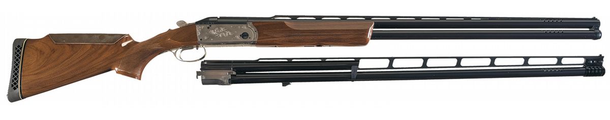 Manufactured circa 1989. The receiver, trigger guard, top latch, break lever and forearm knuckle have the standard hand engraved floral scroll pattern. The over/under barrels are stamped with the matching serial number on the bottom, the barrel flat is stamped with the date code "IH", both barrels are ported, there is a white bead front sight, a steel mid bead sight, they are choked improved modified/full and have 2 3/4 inch chambers with long forcing cones and ejectors. The hanger is unmarked. The adjustable unsingle barrel is stamped with the matching serial number on the bottom, is stamped with the date code "IK", the barrel is threaded for choke tubes with modified installed, is ported, has a white bead front sight, a steel mid bead sight, has a 2 3/4 inch chamber with a long forcing cone and an ejector. Mounted on a standard grade, multi-point checkered walnut forearm with finger grooves and a pistol grip stock with dual palm swells, adjustable soft top comb and factory pigeon faced Pachmayr recoil pad. Length of pull is 14 1/2 inches. With a plastic hardcase, 4 extra Briley series 2 choke tubes (2 IM, 1 M, 1 F), 2 choke cases, gun grease, choke wrench and manual.