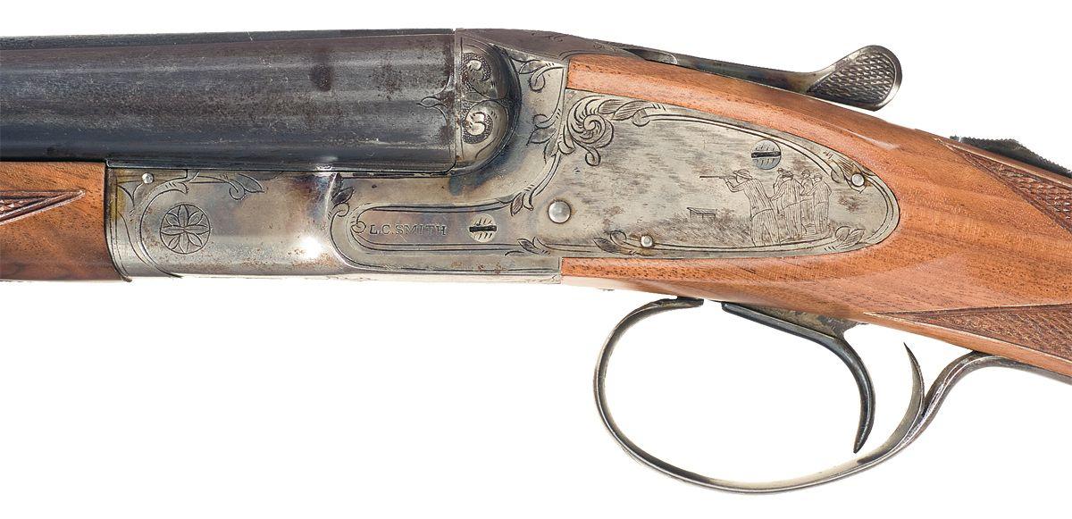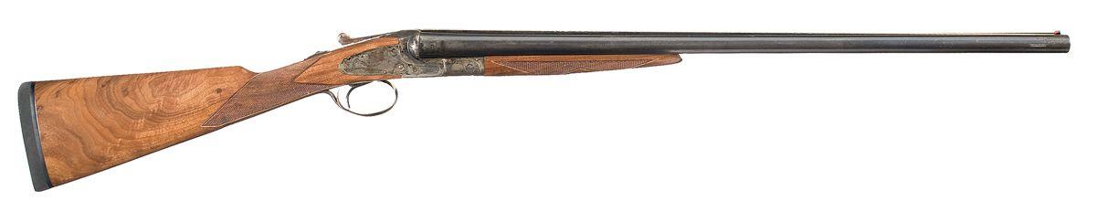 Manufactured from 1890 to 1945. Dual bead sights on solid matte rib, 2 9/16" chambers, choked full/improved modified with ejectors. Simple floral scroll engraving on break lever, forearm hardware, trigger guard and action, with hunter scenes on each side. Nicely figured custom replacement straight grip walnut stock with checkered wrist and forearm with ebony insert. Fitted with a solid Decelerator recoil pad. Length of pull is 13 5/8 inches.
