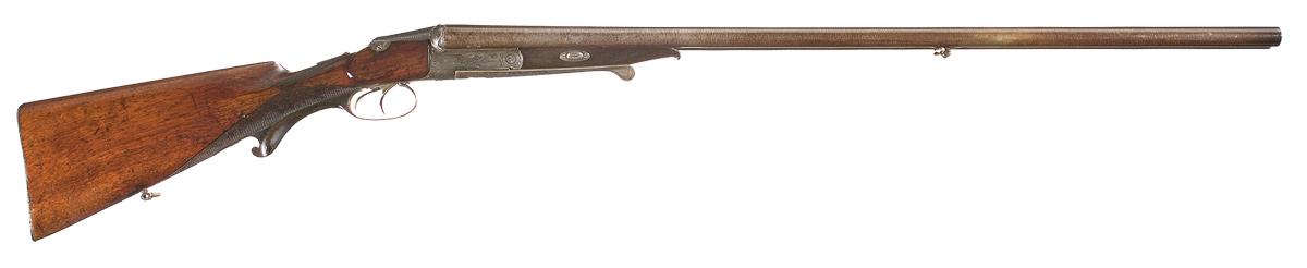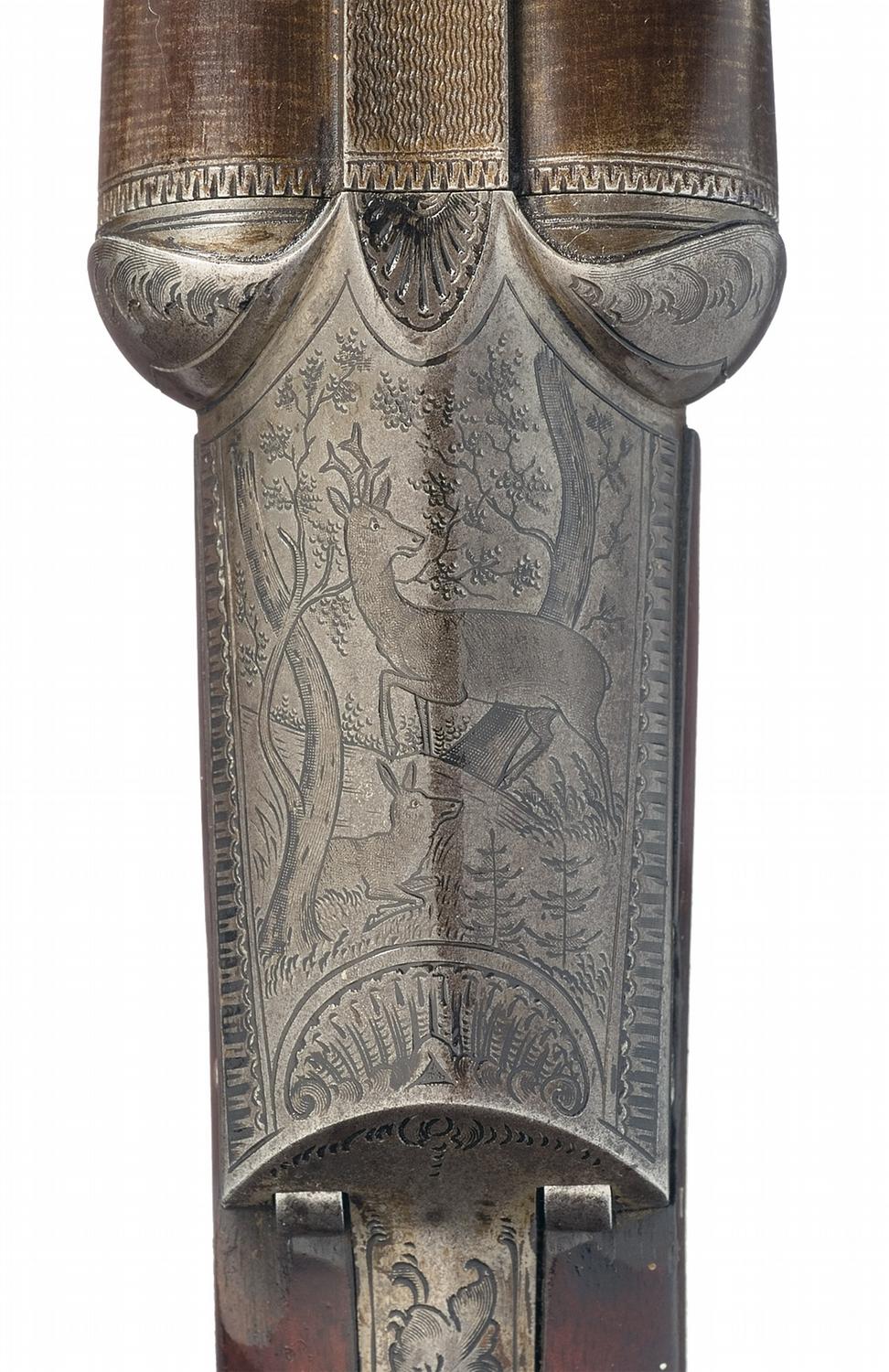 Condition: Very good. The barrels retain 80% of the Damascus pattern with a smooth brown patina and a couple patches of minor pitting. The action has a smooth gray patina with some minor pitting on the under lever. There are a few chips missing, otherwise the buttstock and forearm are fine with some minor dings and scratches, with some minor bruises in the worn checkering.