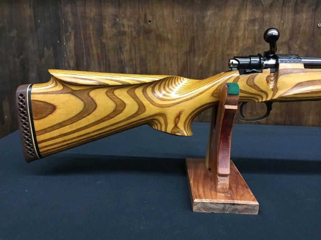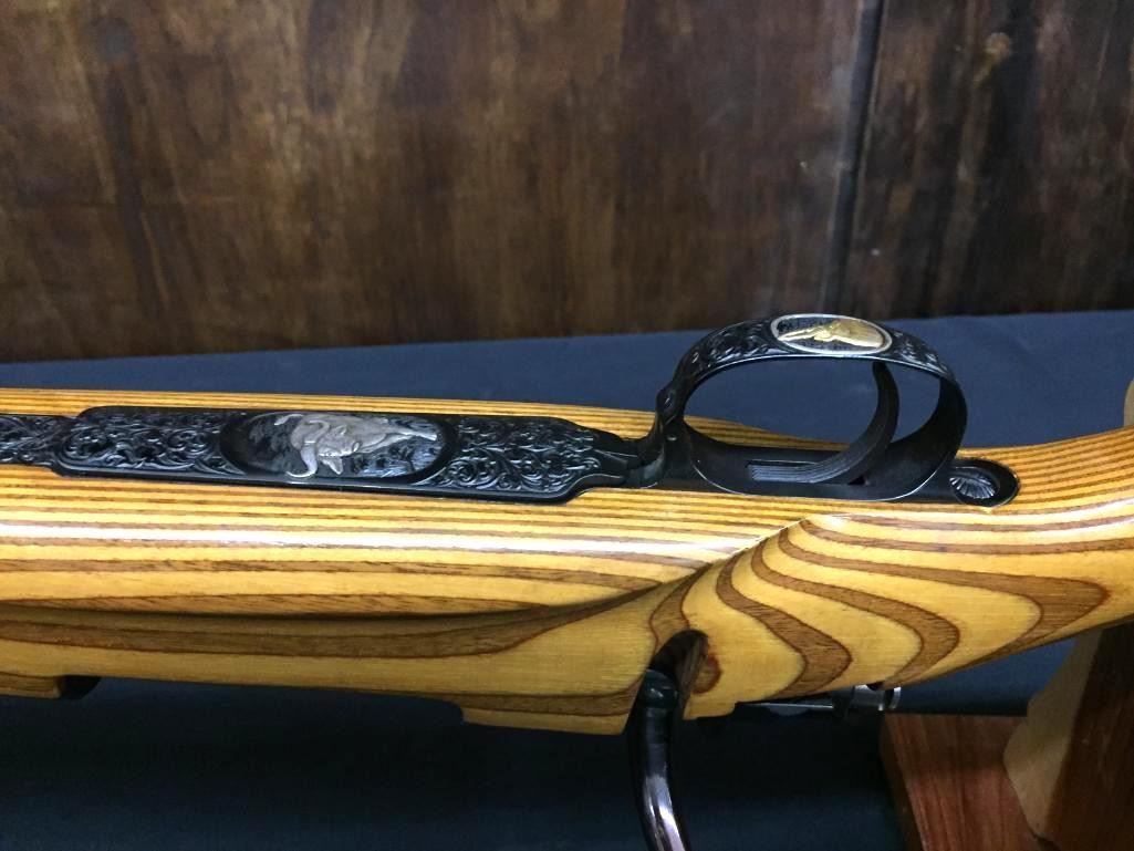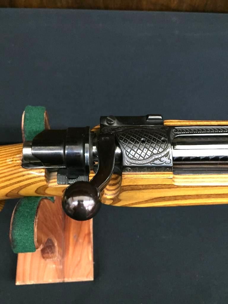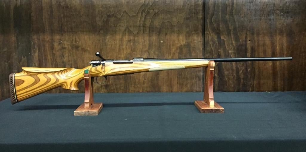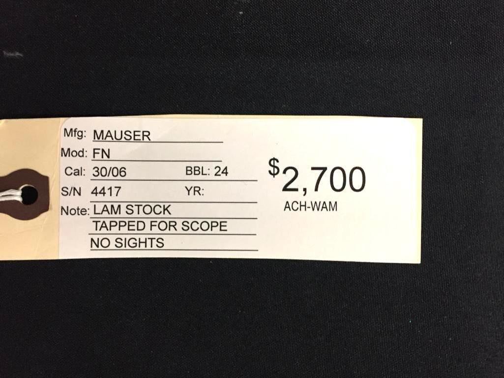 For your bidding pleasure we offer this fancy, engraved, Mauser FN 30/06 caliber bolt action rifle with laminate stock. This is new old stock from a large gun store and part of the old tag is still stuck on the forearm. It has no sites, because it was tapped for a scope. This is in like new condition. Maker: Mauser. Serial No. 4417. Size: Barrel measures 24 inches. Please look closely at the pictures - they are an important part of our description. Shipping: There will be a $15 handling / packaging fee for shipping this lot. The actual cost of postage will be added on top of that. *****This firearm requires an FFL Transfer*****