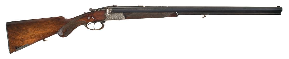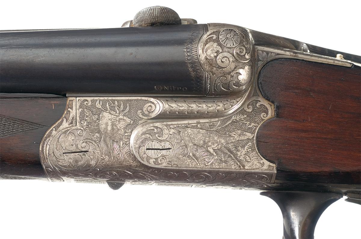 Polished bead front and folding notch rear sights, with a set of claw mount bases at the rear, "Merkel-Suhl" in an oval panel on the rib and Nitro proofs on the underside of the chambers. Extra full chokes, with 2 3/4" chambers and extractor. Near full coverage engraving on the frame, with a scene of stag in the woods on the left side, a dog pointing birds on the right, "SCHROT" and "KUGEL" marked selector switch on top with indicator pins, side mounted Greener safety, single set front trigger and horn trigger guard. Checkered round knob grip stock with engraved cartridge trap, sling swivels, raised shadow-line cheekpiece and a serrated horn buttplate.
