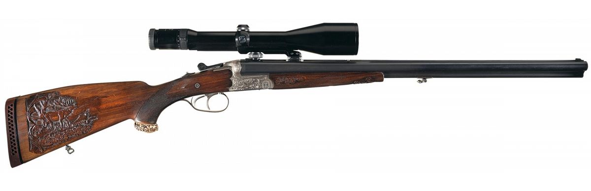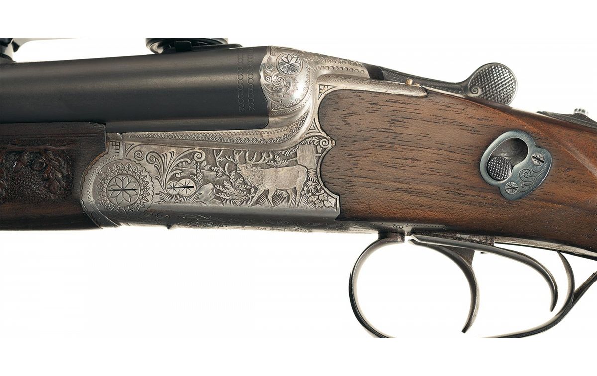 Solid rib barrels with a bead front sight, single folding leaf rear sight that is activated by the tang barrel selector. With a Zeiss Diavari-ZM 3-12x56mm scope on quick detachable mounts. The left barrel is marked 16x70mm and is choked full. The right barrel has a full length sleeve and appears to be chambered for the 5.6x52R. The bottom barrel is marked 7x65R. Nitro proofed and dated 4.74 (April 1974). The scalloped engraved frame has a red stag field scene on the left side and ducks on the right. Upper tang barrel selector and cocking indicator pins, Greener safety and set rifle trigger. Checkered pistol grip stock with a oak leaf carved horn grip cap. German style cheekpiece with ivory oak leaf inlays and oak leaf carvings in the stock on the left side. Large field scene carving of a red stag on the right side. With a vented recoil pad and sling swivel. Standard forearm with checkering and oak leaf carvings. Weight is 8.9 pounds without scope.