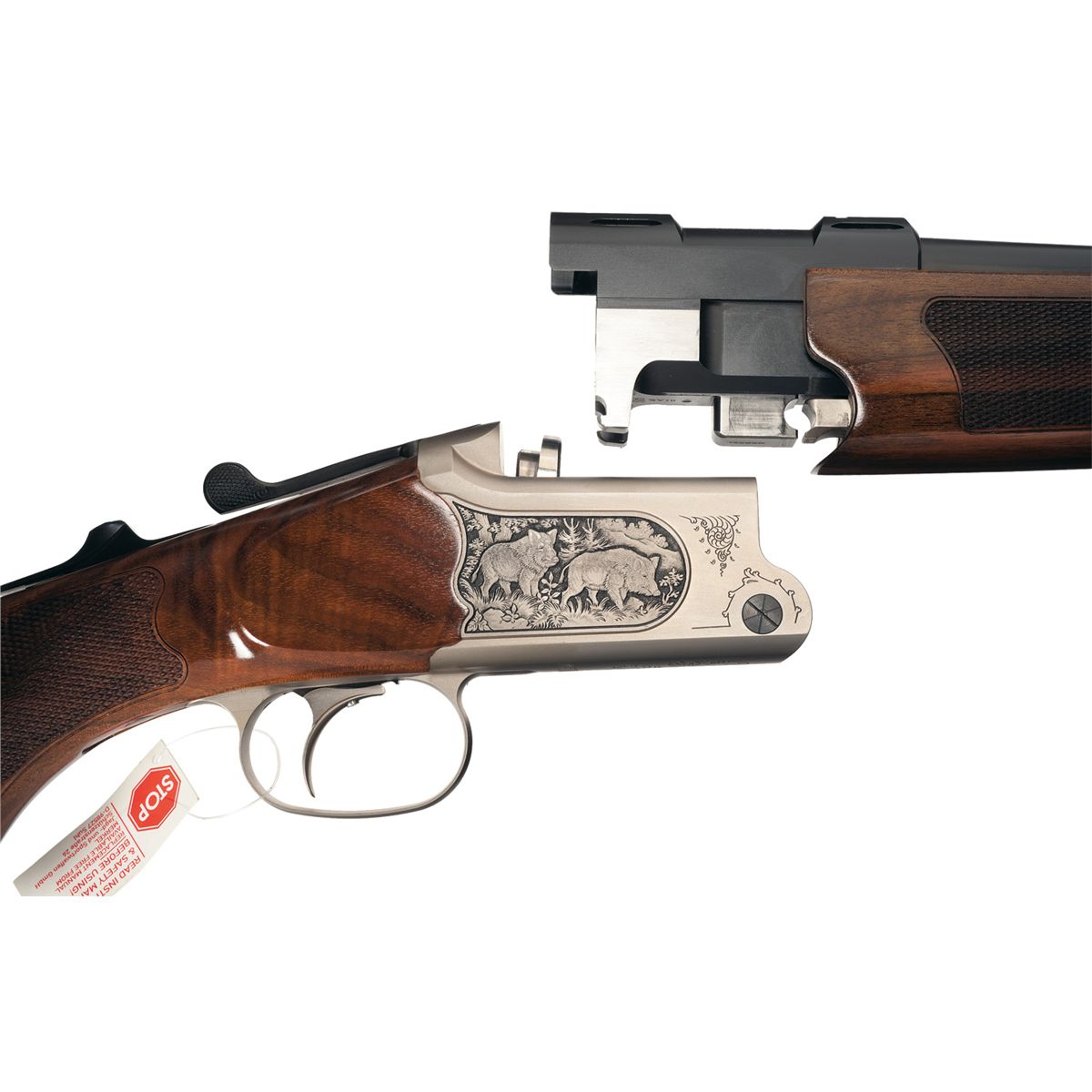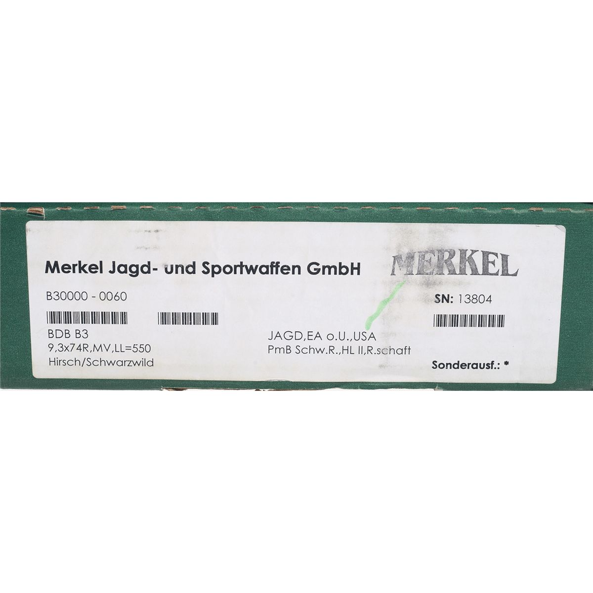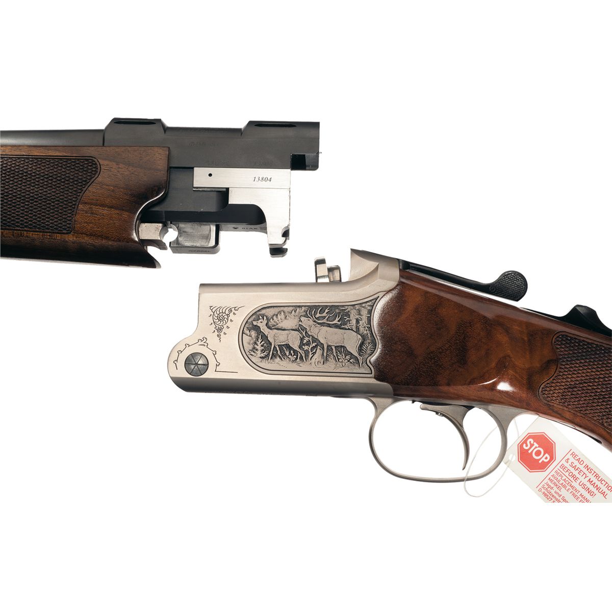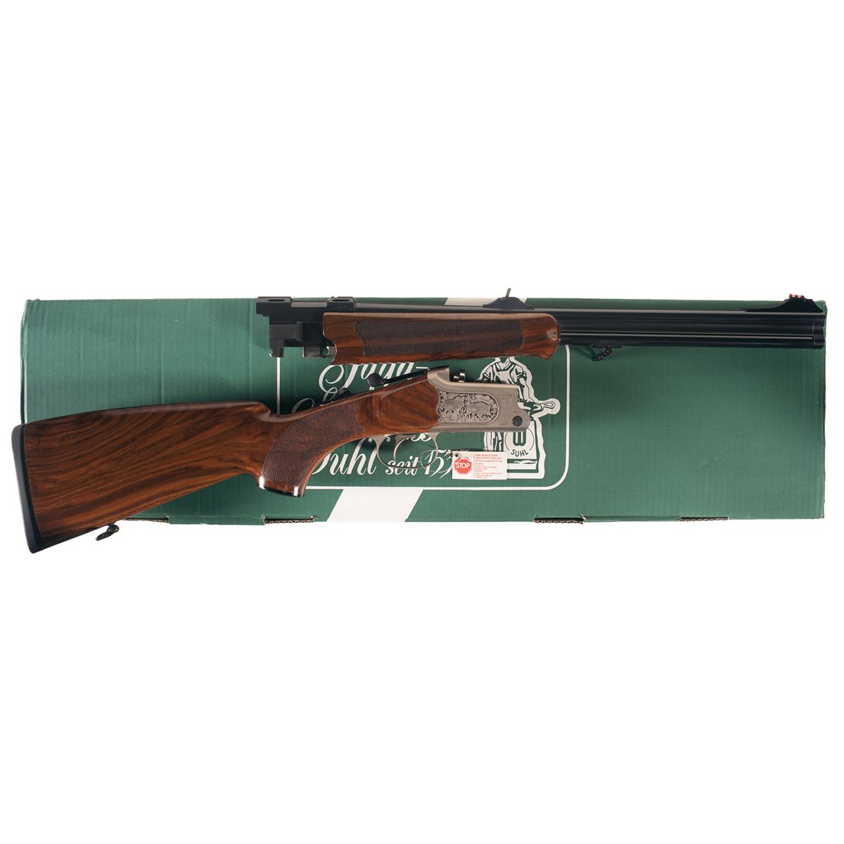 The Model B3 is another classic hunting gun. The high strength Suhl tilted block breech allows for a rapid second shot. The barrel is fitted with ramped high visibility sights, three dot on the rear sight. The top rear barrel is factory machined for scope mounting, equipped with an extractor, and there is a sling swivel mounted on the bottom barrel. The barrels are a matte blue, with a satin grey frame and trigger guard. The frame is engraved with deer in a wooded scene on the left and wild boars in a wooded scene on the right, with light simple scroll engraving and "MERKEL" on the bottom. Double lock hand cocking system, automatic tang mounted safety, detachable Jager tilted block breech, free floating bottom barrel, adjustable single trigger, and mounted with a nicely figured checkered walnut Schnabel forearm and pistol grip stock with plastic grip cap, Bavarian cheekpiece, hogsback comb, solid recoil pad and sling swivel. Complete with the original box numbered to the gun. This rifle is consecutively serial numbered to another Model B3 in this auction. This gun still has the full factory warranty.