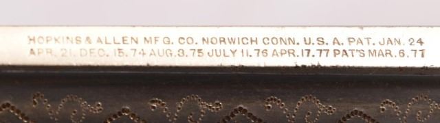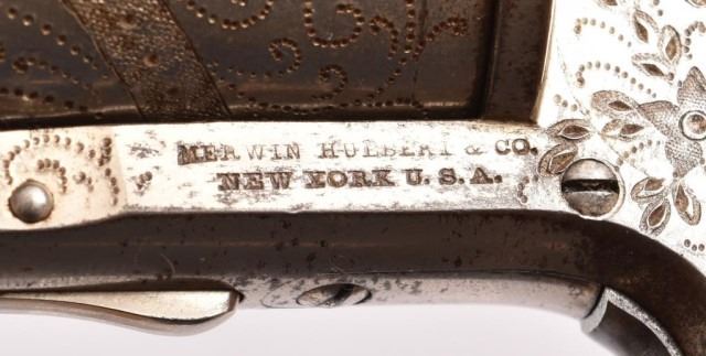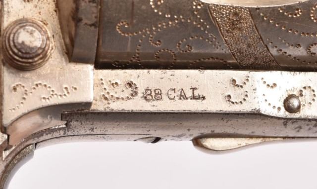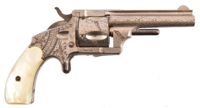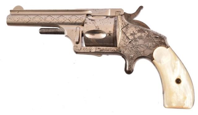 Spur trigger, square butt. Nickel engraved, 3.75" barrel, pearl grips, .38 cal. Serial no. 3907