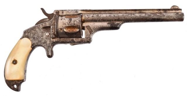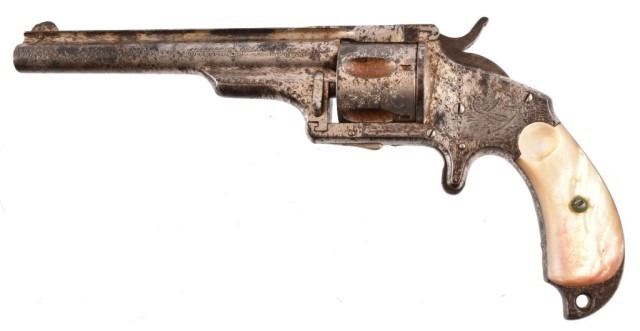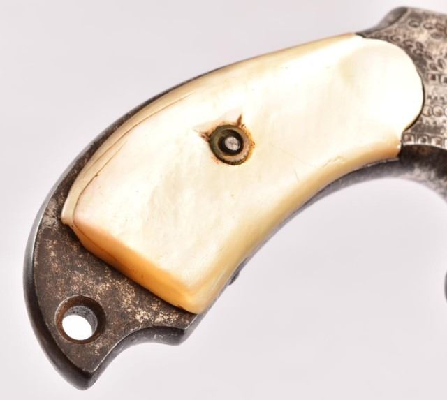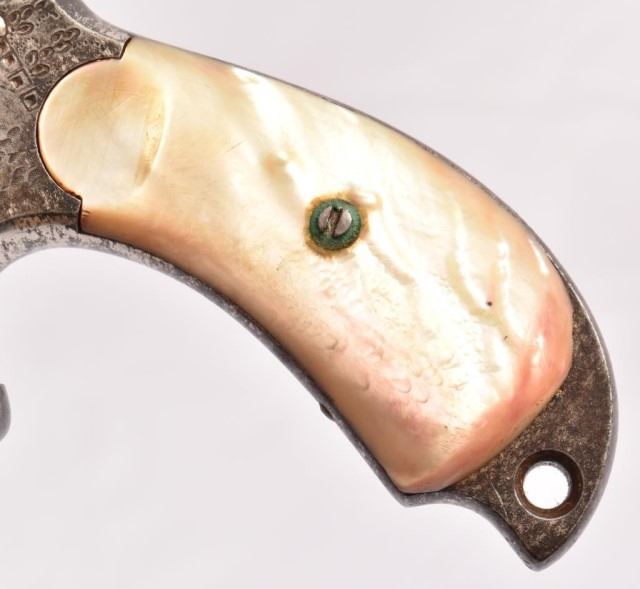 Spur trigger, nickel engraved, pearl bird head grips, 5.5" barrel. .38 cal. Serial no. 6475