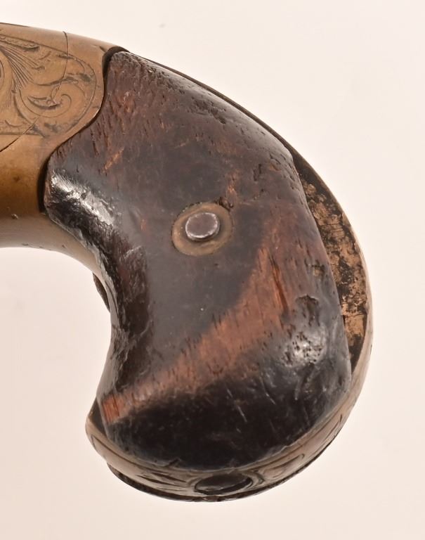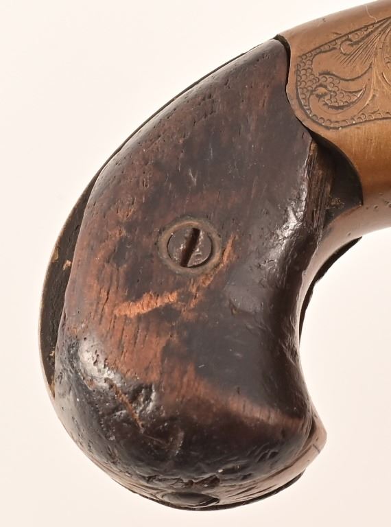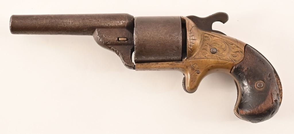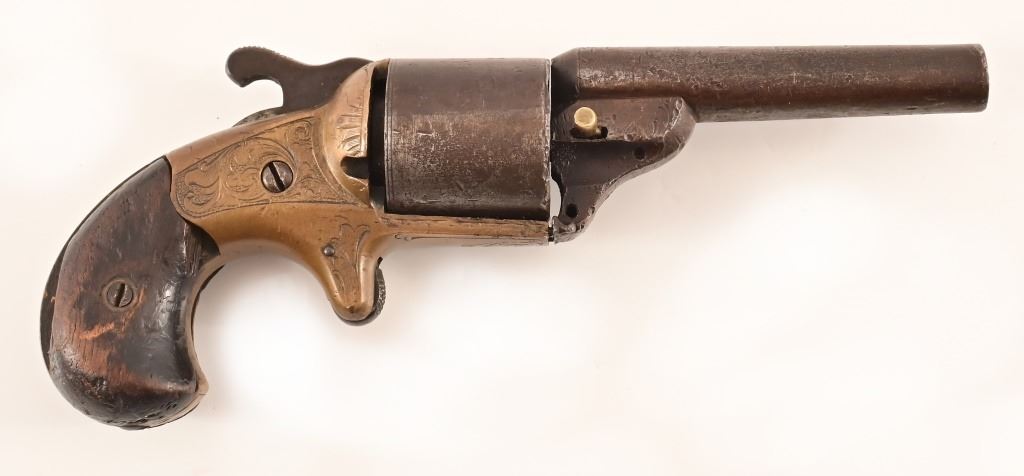 No visible serial number. 3 1/8" barrel, with engraved brass frame. Does have trouble cycling the cylinder, as well as trigger releasing the hammer. Manufactured from 1864 to 1870, one of the most successful competitors to Smith & Wesson, and believed that their sales was one of the reasons for Colt's purchase of the National Arms Co. (Moore's successor) in 1870.