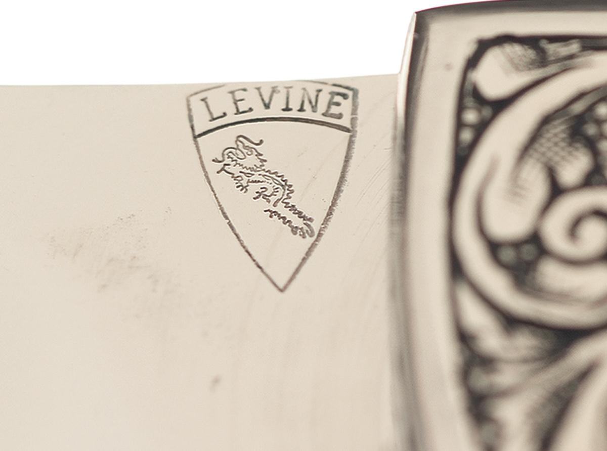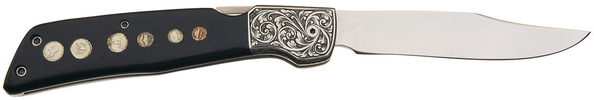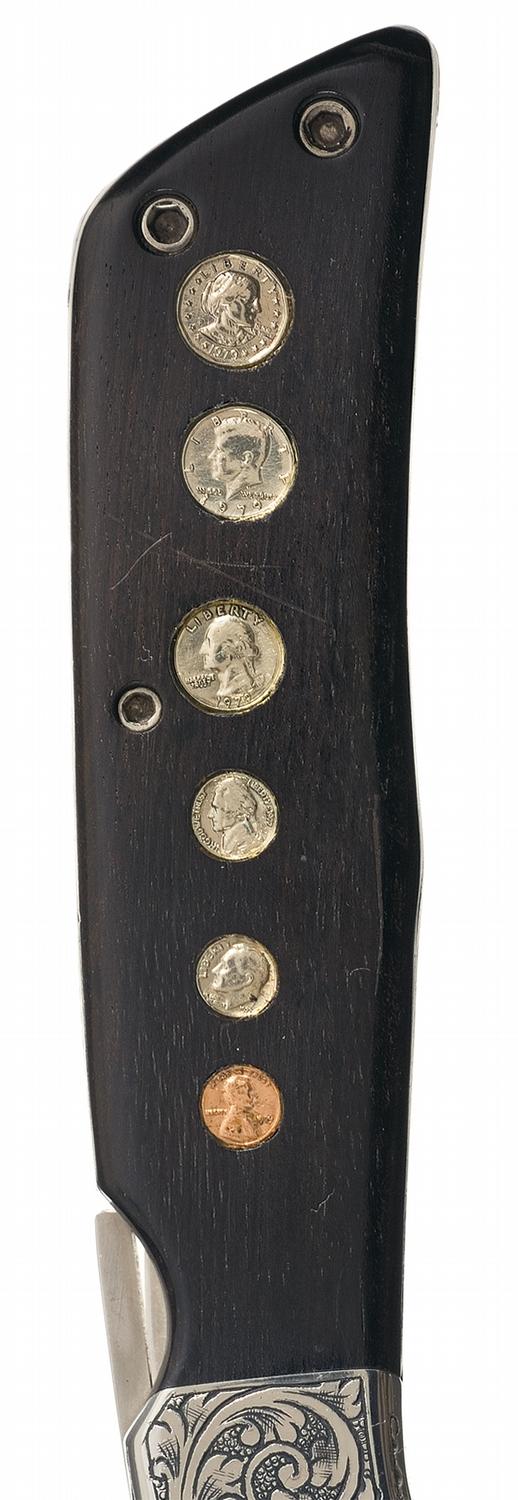 This folding knife was handcrafted by the late Norm Levine, a highly respected custom knifemaker and past voting member of the Knifemakers' Guild. The blade is 4 inches long and is marked with the Levine logo. The front bolster features a scroll engraving on a punch dot background, with the engraver's signature on the left side. Scallop pattern on top of the frame and butt. Fitted with hardwood scales inlaid with six miniature U.S. coins (1 cent penny to 1 dollar), with heads on the left scale, tails on the right scale. OAL: 9 1/4".