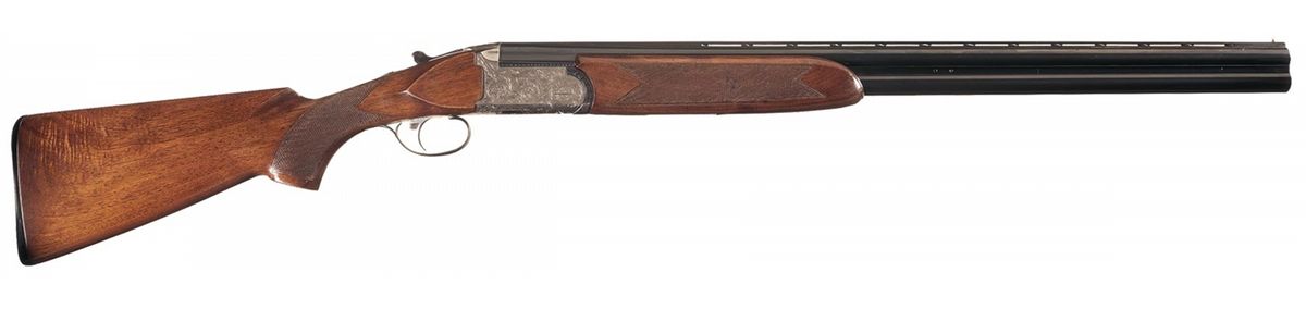 Italian proofed and marked "Fasan" on the left side of the top barrel. Single brass bead on the vent rib. The action, trigger guard and upper tang are floral scroll engraved. Single trigger with barrel selector and a tang mounted safety. Choked full/modified with 3 inch chambers and ejectors. Mounted on checkered walnut forearm and pistol grip stock with a Rottweil marked buttplate. Length of pull is 14 1/4 inches. Complete with 3 barrel insert sets in 20, 28 and 410 Gauge. The 20 gauge set is choked improved cylinder/improved cylinder, 28 gauge, modified/modified and the 410, improved cylinder/improved cylinder. All have 2 3/4 inch chambers with ejectors. Also included is a barrel insert/removal tool and an "Anvil" marked hardcase.