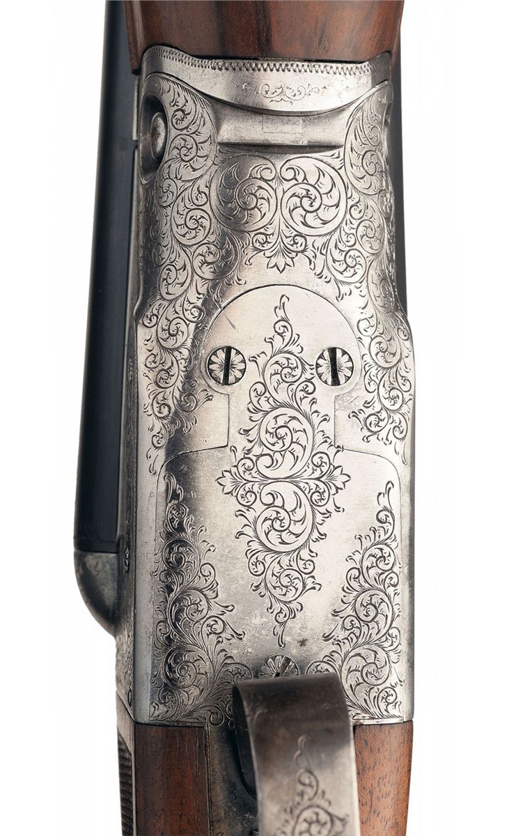 Manufactured in 1908. Replacement ivory bead sight on the matte concave solid rib marked "PARKER BROS. MAKERS,MERIDEN< CONN. VULCAN STEEL" flanked by inward pointing arrows. 3 inch chambers, choked skeet/skeet with extractor. The breech end of the barrels have 5 inch wedge of custom scroll engraving. The action is scroll engraved and marked "PARKER BROS" on each side. The engraving pattern extends to the trigger guard with light engraving on the break lever and forearm hardware. Double triggers, tang mounted safety and mounted with a checkered walnut beaver tail forearm and pistol grip stock with a silver engraved grip cap with two gold relief game birds in a field scene, checkered butt with engraved skeletonized buttplate. Complete with a hard leather takedown case. Length of pull is 14 5/8 inches.