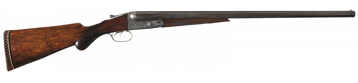 This example was manufactured in 1902. The receiver, trigger plate and trigger guard are engraved with floral scroll. There is a dog on point engraved in an oval on each side and four quail on the trigger plate. The barrels have two ivory bead sights, are choked cylinder/cylinder and have 2 3/4 inch chambers with ejectors. Mounted on a nicely figured, multi-point checkered walnut forearm and round knob pistol grip stock with silver initial oval and recoil pad. Length of pull is 14 1/4 inches.