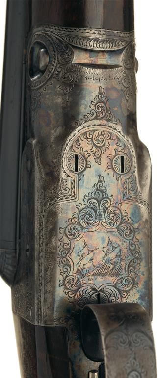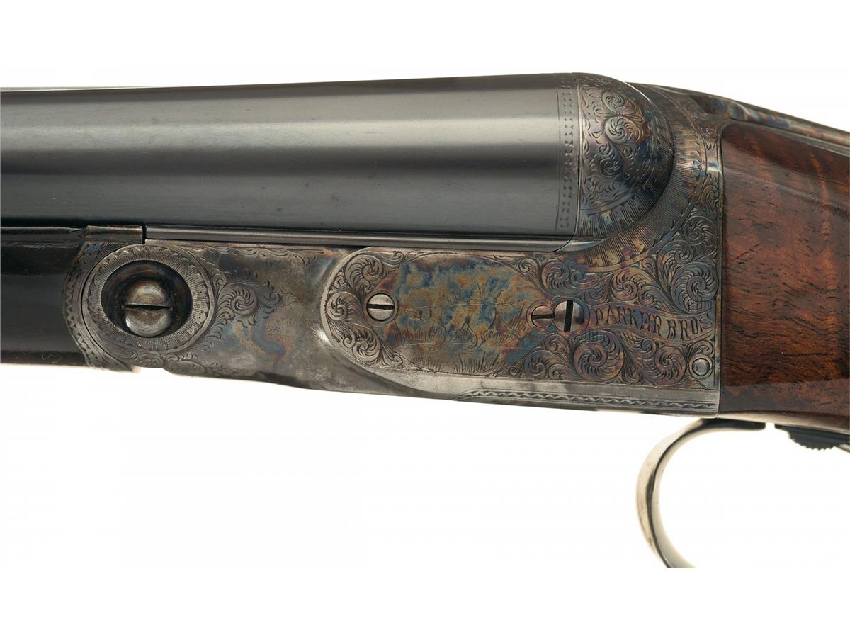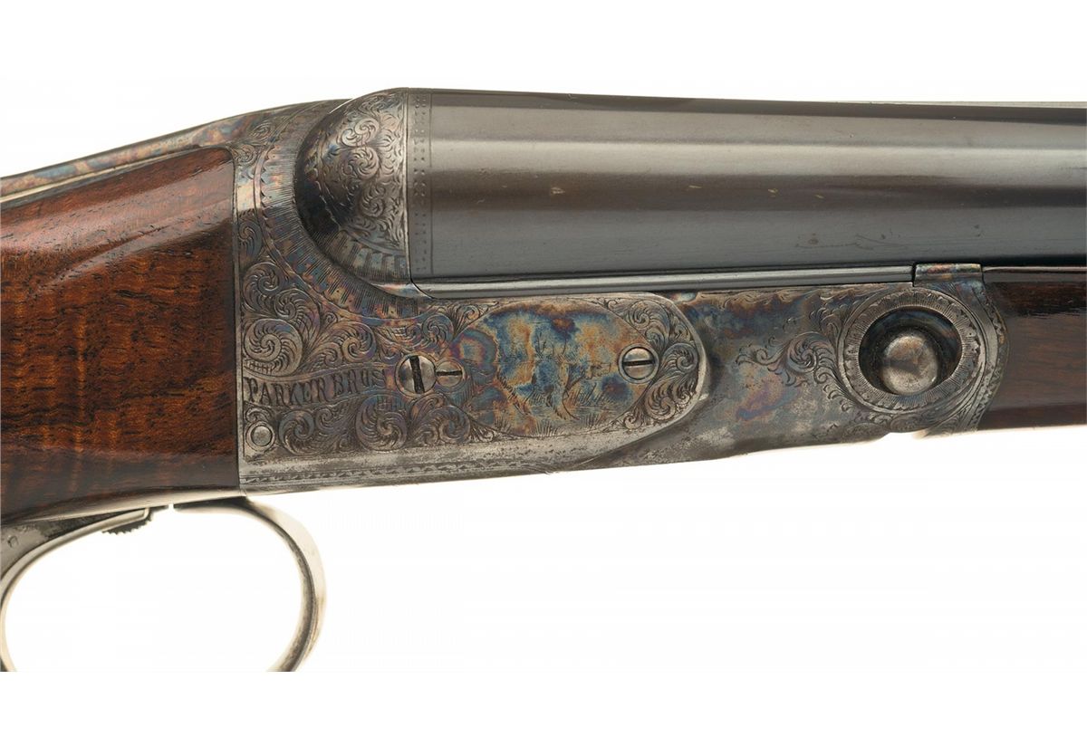 Single ivory bead on the matte concave solid rib marked " PARKER BROS. MAKERS. MERIDEN CONN. TITANIC STEEL.", with improved cylinder/improved modified chokes, 2 3/4 inch chambers and ejectors. Scroll engraved box lock action, with field scenes of hunting dogs and "PARKER BROS." banners on each side, and a marsh scene of 4 ducks on the underside. The floral scroll engraving extends to the break lever, trigger guard and forearm hardware. Equipped a single trigger with selector mounted to the left and manual tang mounted safety. The water table is marked with the five line Parker Bros. patent marking on the right side and "DH/serial number/3" on the left side. The bottom of the rear barrel lug is marked "K1 1/2". Matching numbers on the barrels, lower tang and forearm hardware. Mounted with a multi-point checkered walnut splinter forearm and straight grip stock with tear drop flats, Hawkins vented recoil pad and silver initial oval. Length of pull is 13 7/8 inches. Comes with a light colored leather hard takedown case with leather corner protectors and trim and hunter green lining with a Holland & Holland label affixed to the inside of the lid. In the case is a two piece ebony and brass cleaning rod, bore mop. H&H screwdriver, and nickel H&H oiler and snap caps.