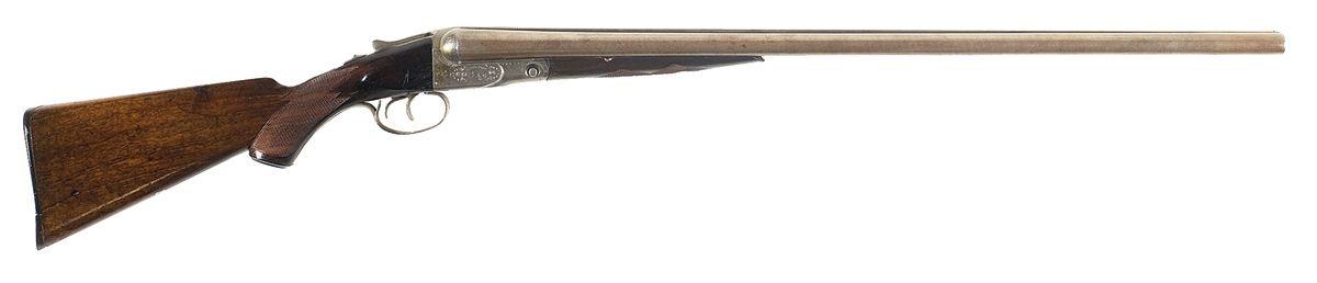 Standard markings with game bird scenes and floral scroll engraving on receiver and floor plate. Re-checkered with minor discoloration. 2 1/2" chambers, full/improved modified chokes with length of pull 14 1/8".
