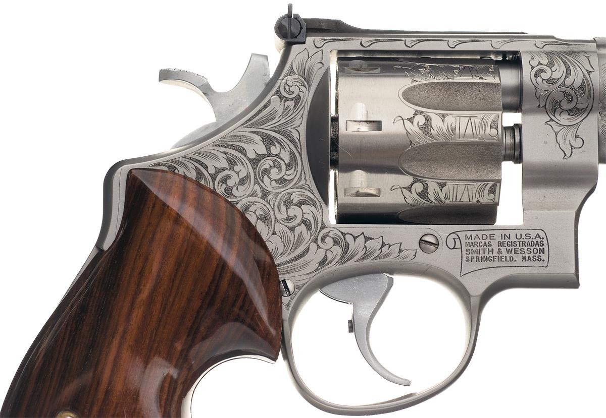 This Performance Center Tactical Edition is limited to 100. The side of the frame and cylinder flats are engraved with a broad leaf floral design with a matte finish in the flutes. The left barrel flat is marked "PERFORMANCE CENTER / TACTICAL EDITION", the right side ".357 MAG - 8 TIMES", the upper left front of the frame is marked with a shield with an intertwined "V8" in the center, the lower left side is marked "ONE of 100" and the Performance Center logo is on the lower left rear of the frame. Blade front sight with brass bead, adjustable rear sight, adjustable trigger stop and fitted with smooth two finger rosewood grips. Complete in a Performance Center Doskocil case numbered to the gun and trigger lock.