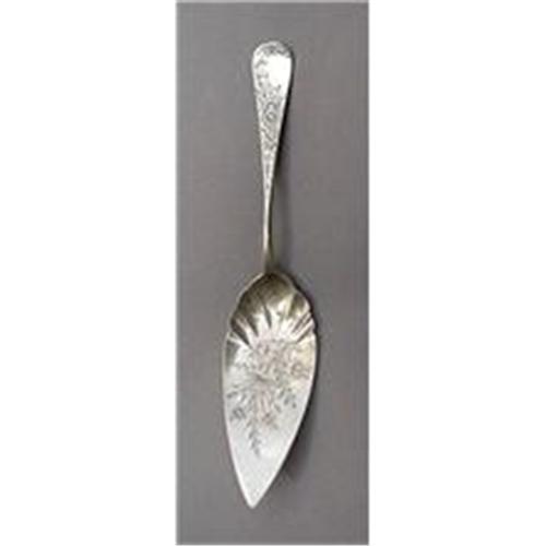 We have a nice collection of engraved coin silver and sterling silver dessert servers. This Pie Server is beautifully engraved with the flowers and c- scroll design, much like the Whiting Antique Lily Engraved pattern.H & S is Hotchkiss and Schroeder , a Syracuse N Y firm , that did their work second half of the 19th century.Other pics may be sent on request. We welcome questions about the collection as well as this beautiful server.